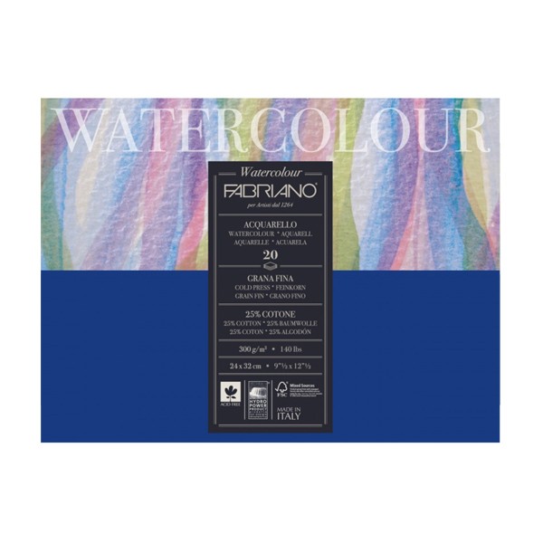 Акварельная бумага серии "Watercolour" от FABRIANO (Италия) ценится за исключительное соотношение цена/качество. Эта бумага популярна и у профессиональных художников, и у тех, кто только делает первые шаги в изобразительном искусстве. Бумага серии "Watercolour" делается из смеси высококачественной целлюлозы и 25% натурального отборного хлопка. Она не содержит кислот, что гарантирует сохранность яркости красок на долгое время. Имеет особую пропитку, обеспечивающую чётко выверенную степень поглощения пигментов. Высокая плотность и прочность делает акварельную бумагу "Watercolour" от FABRIANO устойчивой к многократным правкам работы. Цвет бумаги - белый. Фактура - мелкозернистая. Идеально подойдет для акварели, гуаши, акрила, темперы, чернил, угля и других подобных материалов.