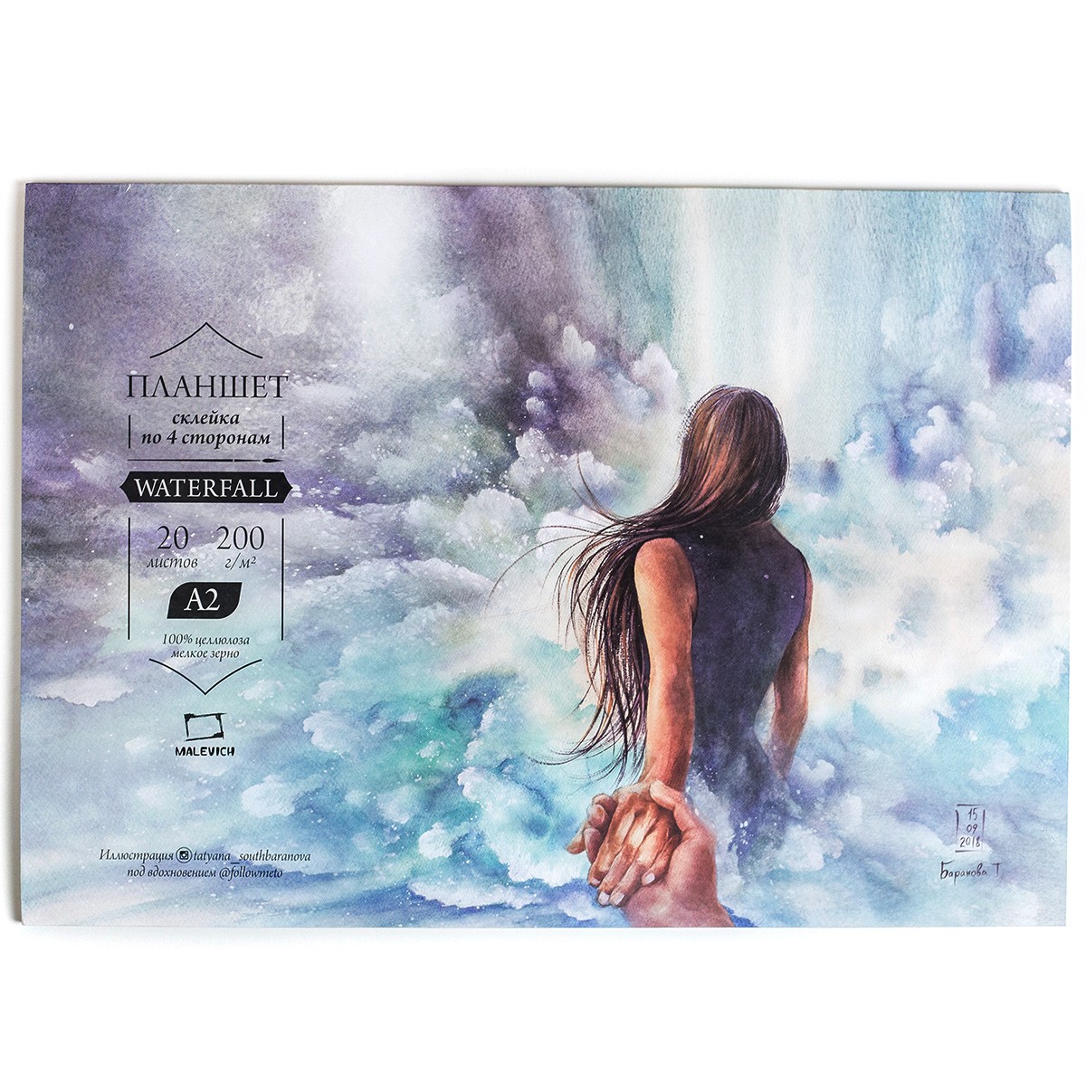 Склейка 20 листов 42х59.4см (формат А2) содержит профессиональную бумагу для акварели "Waterfall" от компании "Малевичъ", сделанную из 100% альфа-целлюлозы. Из бумаги удален лигнин (woodpulp paper), за счет чего она не стареет, не желтеет и сохраняет работу на долгие годы. Бумага обеспечивает равномерную акварельную заливку, впитывает воду, но при этом деформируется слабо. Достаточно стойка к вымыванию. Не съедает цвет, оставляя яркие цвета неизменными. Без кислот. Плотность бумаги 200 г/м2. Фактура - мелкозернистая. Подходит для акварели, темперы, гуаши, акрила, чернил, угля, графита. Станет отличным вариантом для плэнера: за счет проклейки по 4 сторонам бумагу не требуется закреплять на планшете - сама склейка уже является твердой основой, которая не позволяет бумаге деформироваться от воды. После высыхания лист легко удалить канцелярским ножом (для этого предусмотрен непроклеенный уголок).