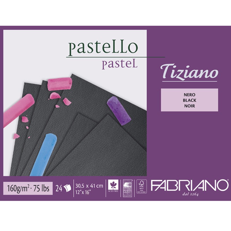Альбом для пастели "Черный" от FABRIANO из серии "Pastello" содержит 24 листа черной бумаги "Tiziano" плотностью 160г/м2, размера 30.5x41см (чуть больше формата А3), в склейке по одной стороне.