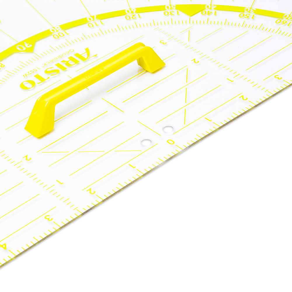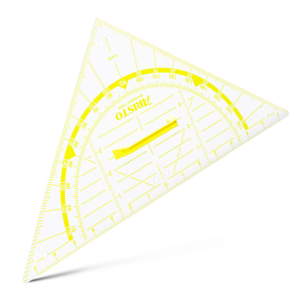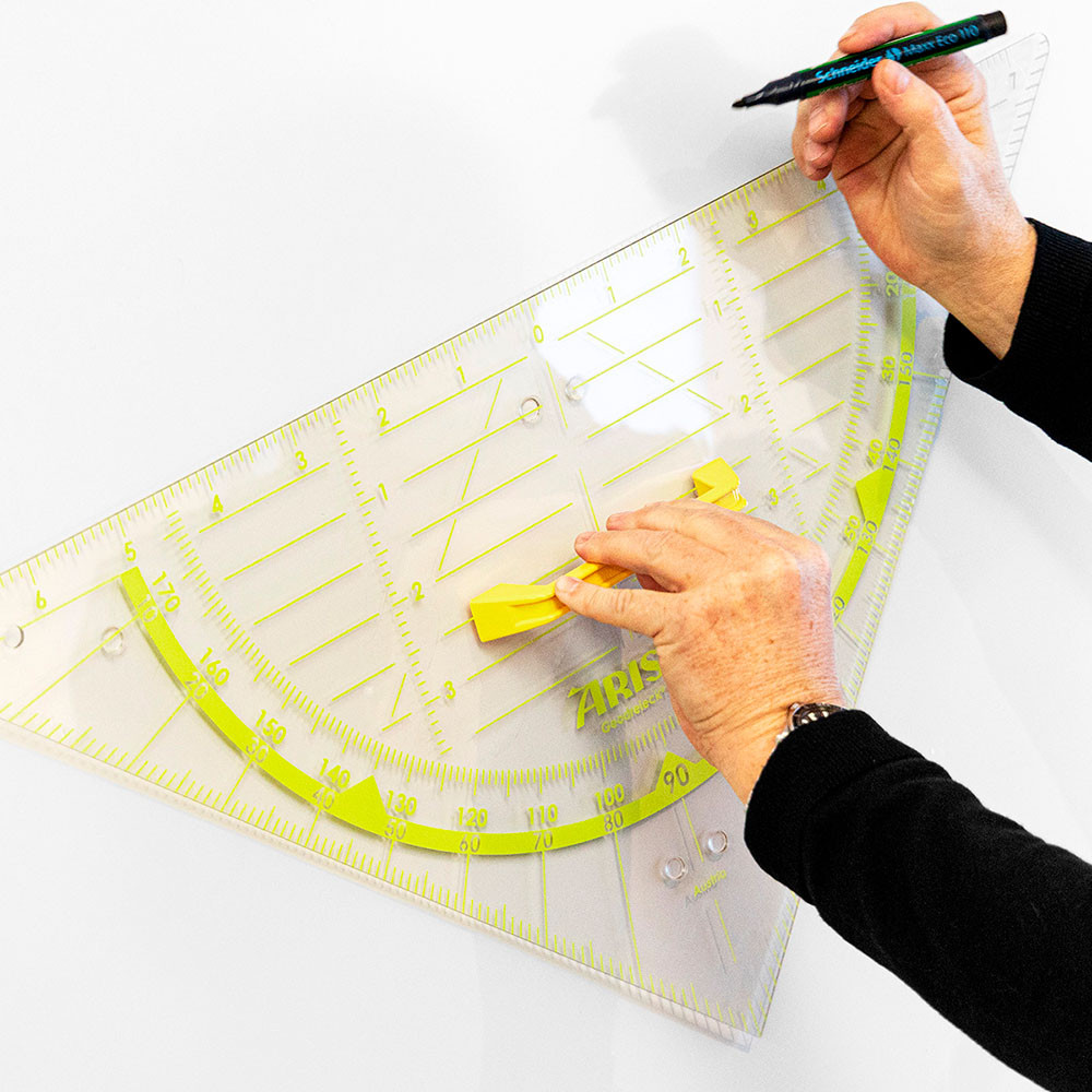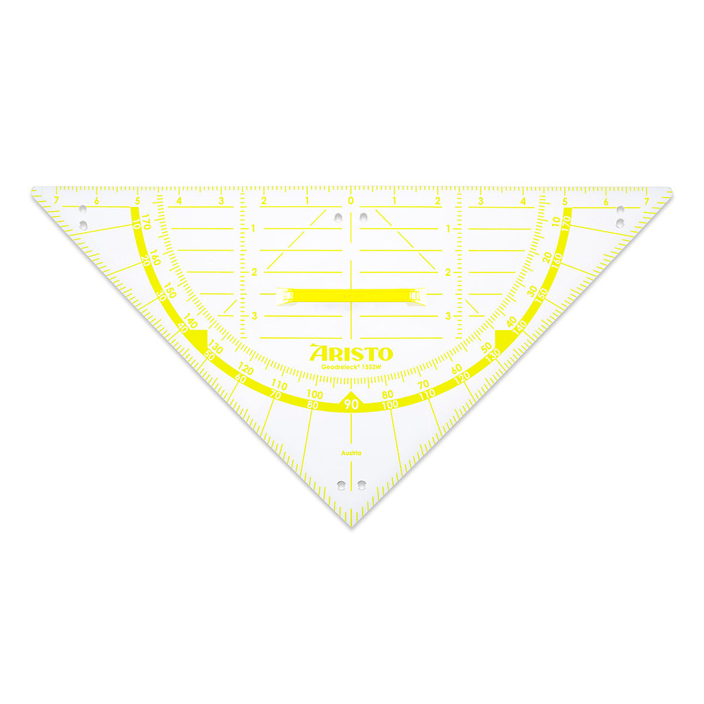 С инструментами для рисования на доске Aristo даже при больших размерах можно добиться очень высокой точности. Угольник настенный визуально схож с треугольником Aristo студентов, что гарантирует выгодное обучение. Узор деления Aristo Blackboard Geodreieck® AH1552W точно соответствует оригинальному Aristo Geodreieck® и, таким образом, объединяет в одном чертежном инструменте масштаб, шкалу симметрии и параллельную линейку. Корпус и ручка выполнены из высококачественного пластика. Прозрачные резиновые шпильки гарантируют, что линейка не соскользнет при рисовании.