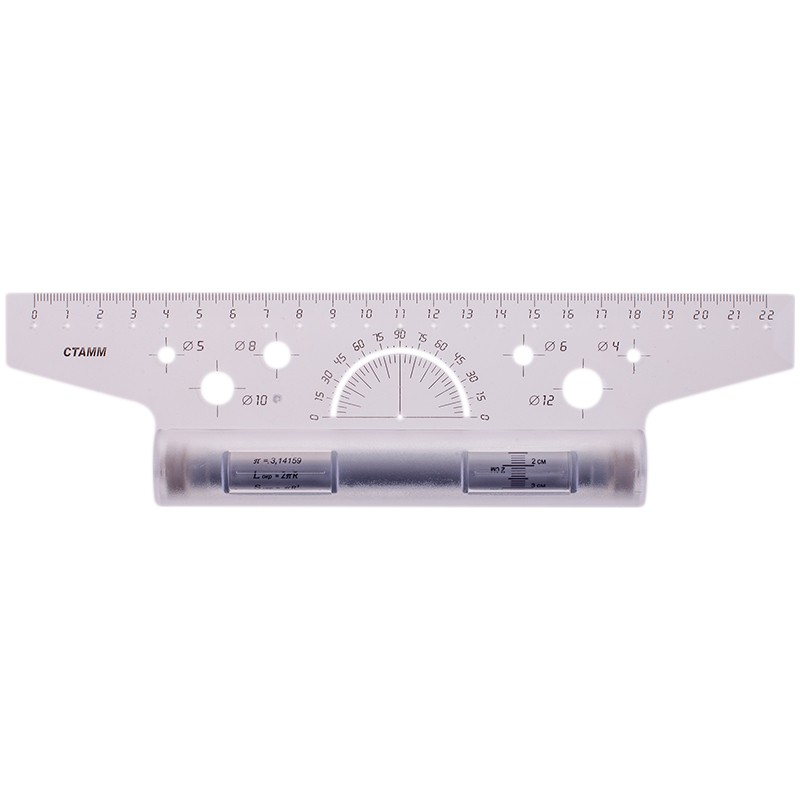 Содержит транспортир 180 градусов и трафареты окружностей. Пластиковый/металлический ролик. Равномерно перемещается по бумажной поверхности. Изготавливается из высококачественного пластика на современном оборудовании.