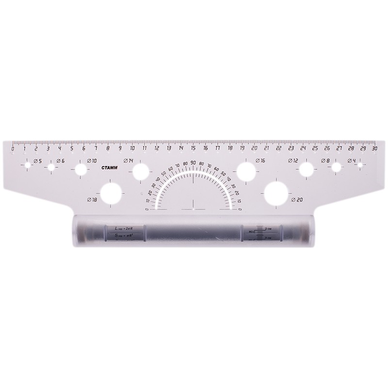 Содержит транспортир 180 градусов и трафареты окружностей. Пластиковый/металлический ролик. Равномерно перемещается по бумажной поверхности. Изготавливается из высококачественного пластика на современном оборудовании.