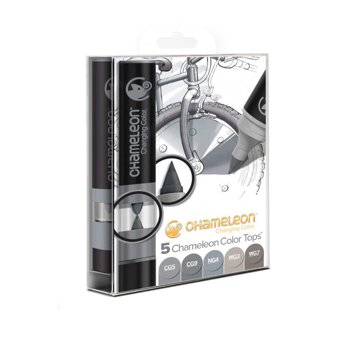 Набор "Chameleon 5 Color Tops Gray Tones" включает в себя 5 цветных дополнительных блоков для смешивания, заправленных чернилами серых оттенков: NG4 Серый нейтральный 4, CG5 Серый холодный 5, CG9 Серый холодный 9, WG3 Серый теплый 3, WG7 Серый теплый 7.