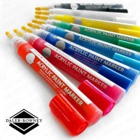 Маркеры акриловые из коллекции "Simply" от английской компании "Daler-Rowney" с клапанной системой прокачки отлично пишут практически на любой поверхности - на бумаге, стекле, пластике, дереве, ткани, керамике и т.п. Маркеры заполнены акриловой краской (5,3 мл) и оснащены 2-миллиметровым пуле-образным наконечником. Толщина линий составляет 2-3 мм. После нанесения акриловая краска быстро высыхает и уже не смывается водой (абсолютно водостойкая). Маркеры можно считать "универсальными", поскольку они подходят для самых разных ремесленных и художественных проектов.