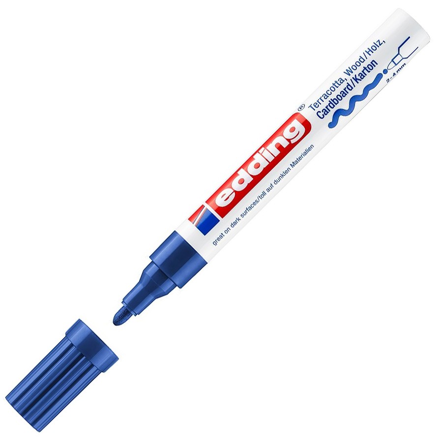 С матовым лаковым маркером "edding 4000" письмо, рисование и создание декора на пористых поверхностях не представляет никакой проблемы. Маркер прекрасно подходит для терракоты, древесины, холста, картона и подобных материалов. Его полуматовые чернила превосходно ложатся на изделия ручной работы, например, на горшки для цветов, небольшие предметы мебели или декоративные подносы. Чернила подходят даже для очень впитывающих материалов, таких как обои, шероховатые оштукатуренные стены, кожа, и отличаются стойкостью как к воздействию воды, так и к стиранию. Маркер обеспечивает долговечное покрытие при использовании как внутри помещений, так и на улице. Ширина штриха округлого наконечника составляет 2-4 мм. Цвет - синий. Размеры маркера - 14.3 x 1.8 x 1.8 см.