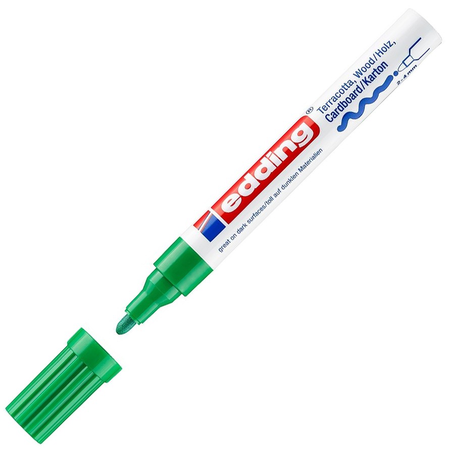 С матовым лаковым маркером "edding 4000" письмо, рисование и создание декора на пористых поверхностях не представляет никакой проблемы. Маркер прекрасно подходит для терракоты, древесины, холста, картона и подобных материалов. Его полуматовые чернила превосходно ложатся на изделия ручной работы, например, на горшки для цветов, небольшие предметы мебели или декоративные подносы. Чернила подходят даже для очень впитывающих материалов, таких как обои, шероховатые оштукатуренные стены, кожа, и отличаются стойкостью как к воздействию воды, так и к стиранию. Маркер обеспечивает долговечное покрытие при использовании как внутри помещений, так и на улице. Ширина штриха округлого наконечника составляет 2-4 мм. Цвет - зеленый. Размеры маркера - 14.3 x 1.8 x 1.8 см.