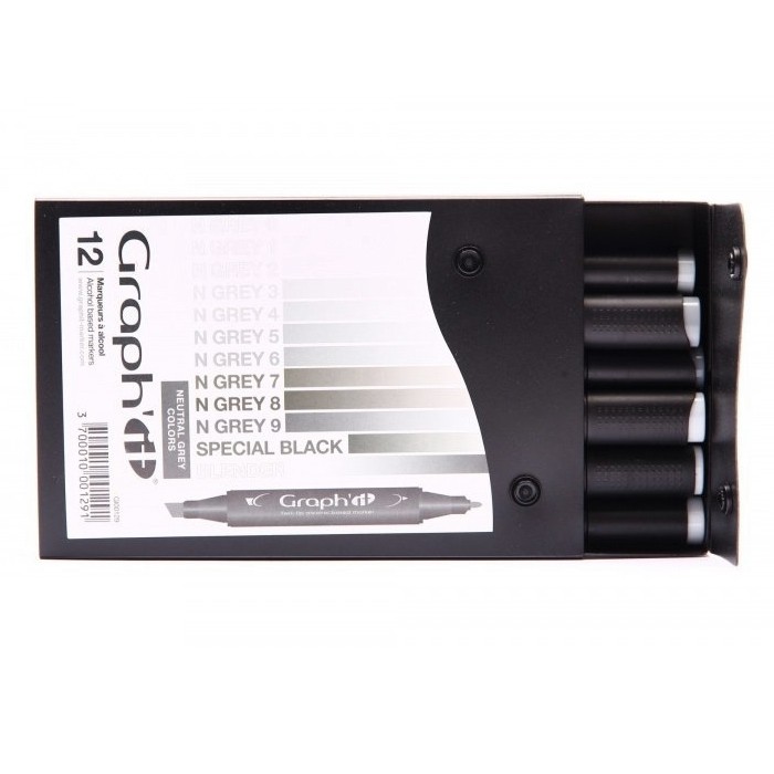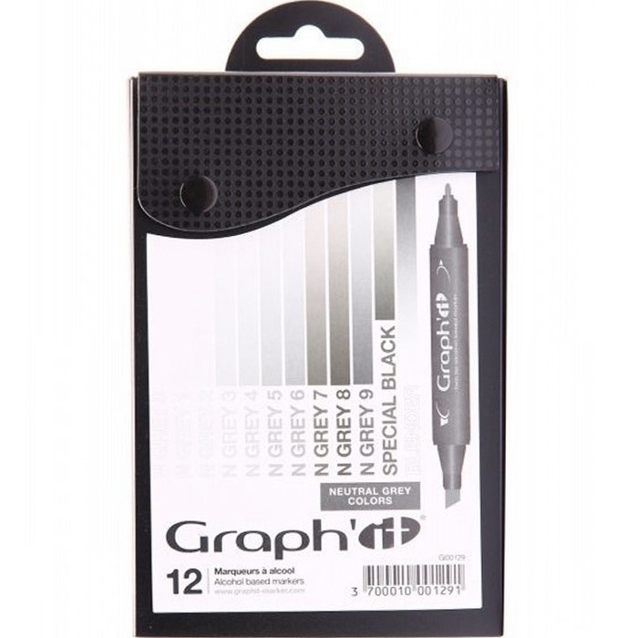 Набор из 12ти спиртовых двухсторонних маркеров "Серые нейтральные" ("Neutral Greys") французской марки "Graph'it" включает в себя следующие цвета: 0000 Блендер (бесцветный), 9500 Серый нейтральный 0, 9501 Серый нейтральный 1, 9502 Серый нейтральный 2, 9503 Серый нейтральный 3, 9504 Серый нейтральный 4, 9505 Серый нейтральный 5, 9506 Серый нейтральный 6, 9507 Серый нейтральный 7, 9508 Серый нейтральный 8, 9509 Серый нейтральный 9, 9905 Черный специальный.