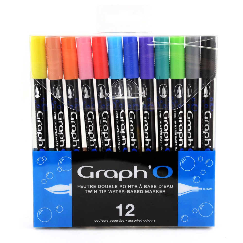 Набор из 12ти акварельных двухсторонних маркеров "Graph'O" французской марки "Graph'it" включает в себя следующие цвета: 1170 Желтый солнечный, 2220 Желтый дынный, 3120 Верблюжья шерсть, 5120 Розовый принцесса, 5220 Красный томат, 6180 Синий ирис, 7135 Голубой атолл, 7185 Ультрамарин, 8180 Зеленая секвойя, 8260 Зеленый лайм, 9504 Серый нейтральный средний, 9909 Черный.