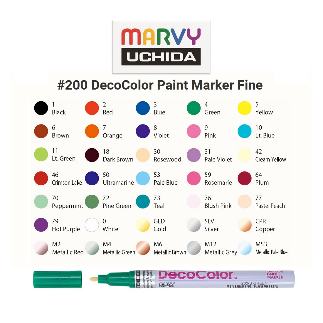 Маркер лаковый "DecoColor Fine" от MARVY с тонким скругленным наконечником, дающим линии 1-2мм. Маркер пишет на любой поверхности: стекле, дереве, пластике, керамике, камне, металле. Красивые непрозрачные цвета. Свето- и водостойкие чернила с лаковым эффектом сохнут в течении нескольких секунд, не боятся атмосферных осадков. Маркер помещен в вакуумную упаковку. Перед началом работы маркер нужно встряхнуть, потом нажимать на стержень, пока на нем не проступит краска.
