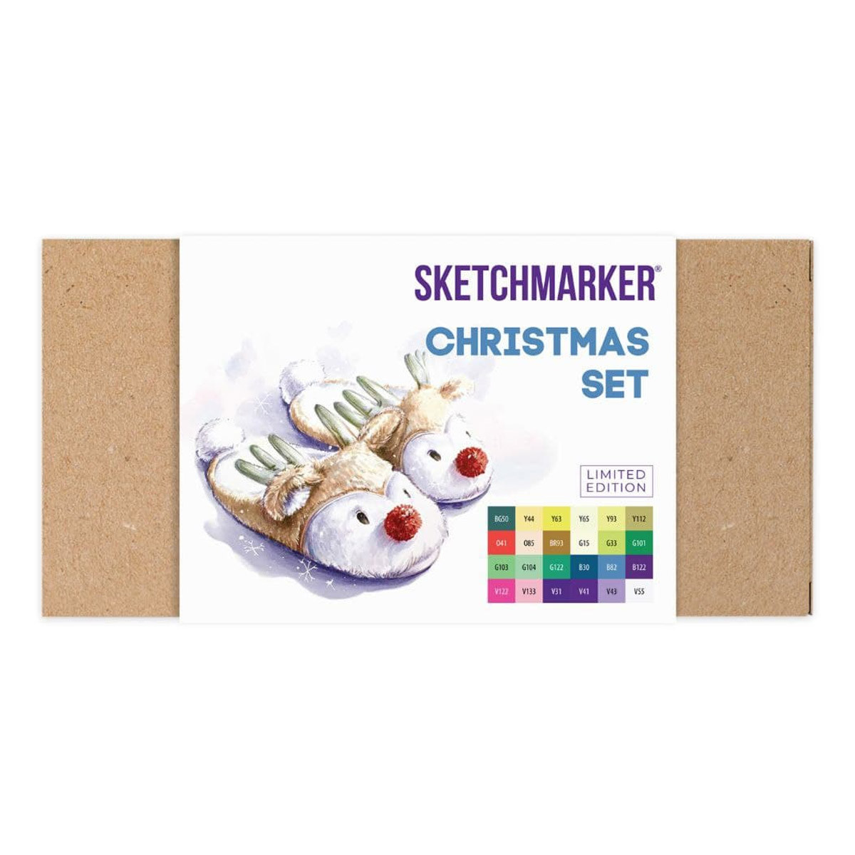 Набор спиртовых маркеров SKETCHMARKER "Christmas Set", входящий в лимитированную серию, собрала и проиллюстировала Анастасия Сараева. В составе набора: черный линер, два пигментных маркера Paintman (черный и белый), скетчбук, а также спиртовые маркеры с наконечниками «пуля» и «долото» 24 цветов (см. ниже таблицу "Цвета набора").