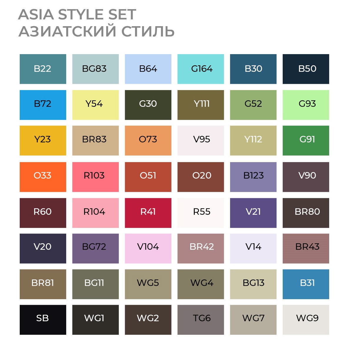 Набор маркеров упакован в прозрачный пластиковый органайзер. В набор входят 48 цветов (см. ниже таблицу "Цвета набора").