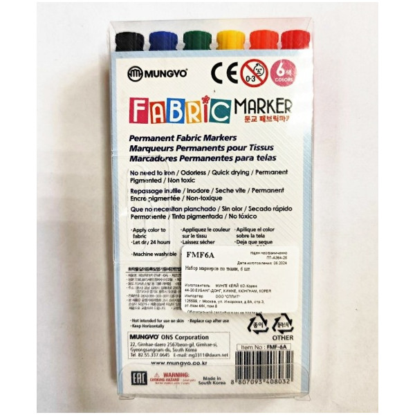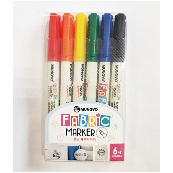 В наборе 6 перманентных маркеров для декорирования ткани. Маркеры отлично пишут и рисуют на тканях различного типа, быстро высыхают, нанесенный рисунок не исчезает после стирки.