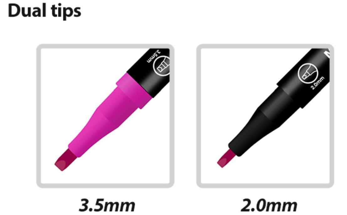 Этот набор идеально подойдет для тех, кто только начинает осваивать искусство каллиграфии или хочет разнообразить свои творческие проекты яркими цветами. Маркеры имеют двухстороннюю конструкцию, предлагая два разных наконечника: тонкий (2 мм) для точных линий и более широкий (3,5 мм) для создания насыщенных штрихов и заливок.