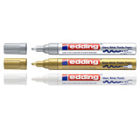 Глянцевый лаковый маркер "edding 750" предназначен для создания высокоукрывистых, перманентных и не поддающихся размазыванию надписей или декора. Его перманентные плотные чернила прекрасно ложатся на материалы, на которых не способны удержатся чернила других маркеров. Он отлично пишет на гладких и даже темных и прозрачных материалах, например, на стекле, металле, пластмассе и глянцевой бумаге. Ширина штриха округлого наконечника составляет 2-4 мм. Лаковые пигментные чернила быстро сохнут, отличаются устойчивостью к атмосферным воздействиям, исключительной светостойкостью и стойкостью к стиранию. Все цвета устойчивы к воздействию температур вплоть до 400°C. Чернила практически не имеют запаха и не содержат толуола и ксилола. В набор входят 3 цвета: золото, серебро и белый. Размеры маркера - 14.1 x 1.5 x 1.5 см.