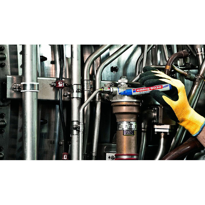 В авиационной, ядерной или судоходной отраслях крайне важно использовать инструменты, не оказывающие отрицательного воздействия на оборудование. Высокотехнологичный маркер edding 8030 NLS с чернилами с низким уровнем коррозии соответствует немецкому авиационному стандарту LN 9051, что является одной из причин его использования в авиационной, ядерной и судостроительной отраслях. Его водостойкие и светостойкие чернила также содержат мало хлора и галогена, что делает их жизненно важным инструментом для этих узкоспециализированных областей.