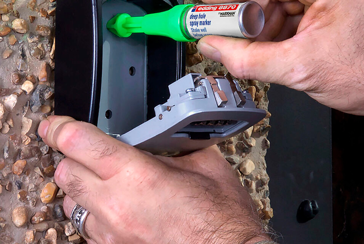 Встряхните спрей маркер для труднодоступных мест. Поверните ограничитель на колпачке и разместите так, чтобы он мог войти в паз. Поместите наконечник маркера в просверленное отверстие, а затем надавите на маркер. Зеленым мелом на поверхность будет нанесена маркировка. Используйте маркировку для точного сверления. Неоновый зеленый мел легко стирается, не оставляя следов.