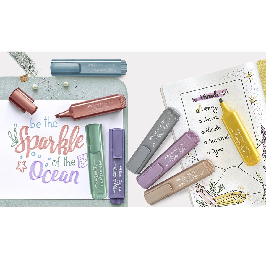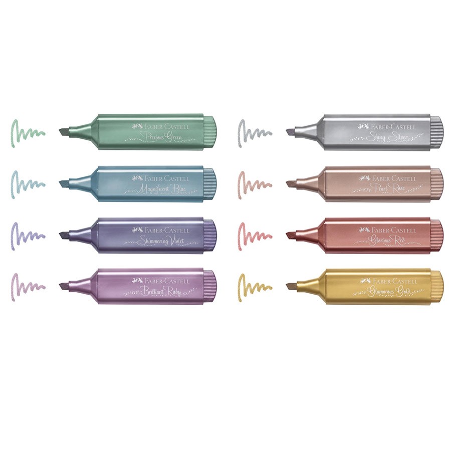 Текстовыделители "Metallic Textliners 46" от Faber-Castell изготовлены из чернил на водной основе с тонким прозрачным мерцанием. Наконечник "долото" позволяет получить 3 разные ширины линии: 1мм, 2мм и 5мм. Текстовыделители подходят для всех популярных типов бумаги и обеспечивают отличное цветное покрытие. Их можно использовать для заметок, для оформления журналов, надписей, для изготовления открыток, или для любого другого проекта, который требует некоторого блеска. В набор входят 8 текстовыделителей следующих цветов: золотой, серебряный, розовый металлик, рубиновый металлик, голубой металлик, зеленый металлик, красный металлик, фиолетовый металлик.