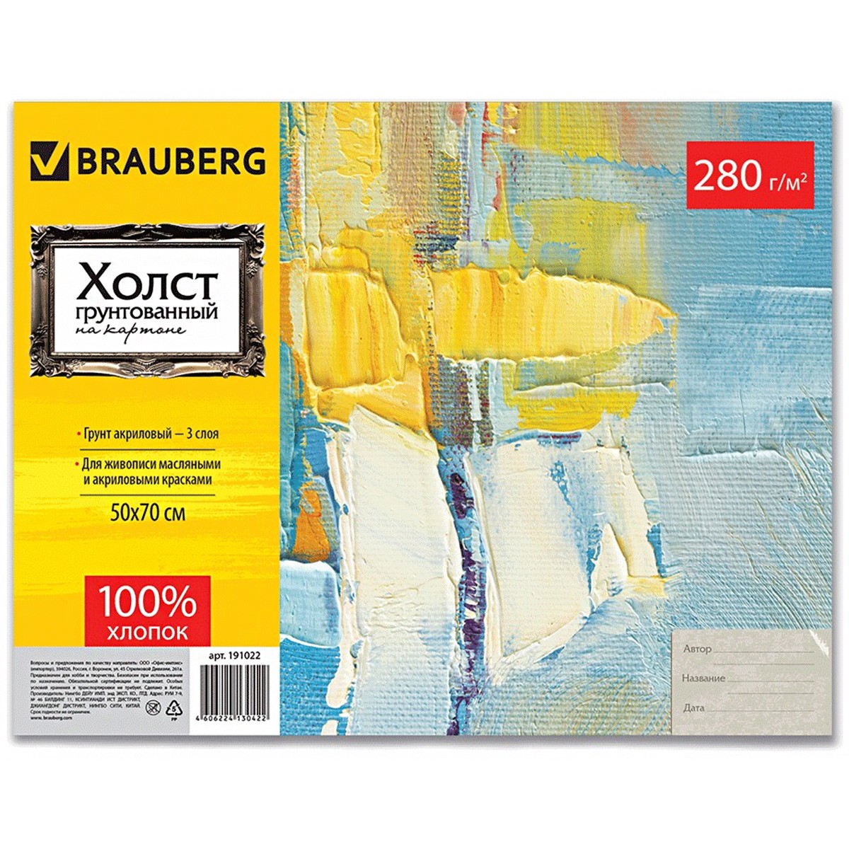 Грунтованный холст на картоне "Classic" от немецкой компании "Brauberg". Используется для работы масляными, темперными и акриловыми красками. Предназначен для начинающих художников, для учеников художественных школ и студентов. Размер - 50х70см. Материал - 100% хлопок. Плотность - 280 г/м2. Поверхность: мелкое зерно.