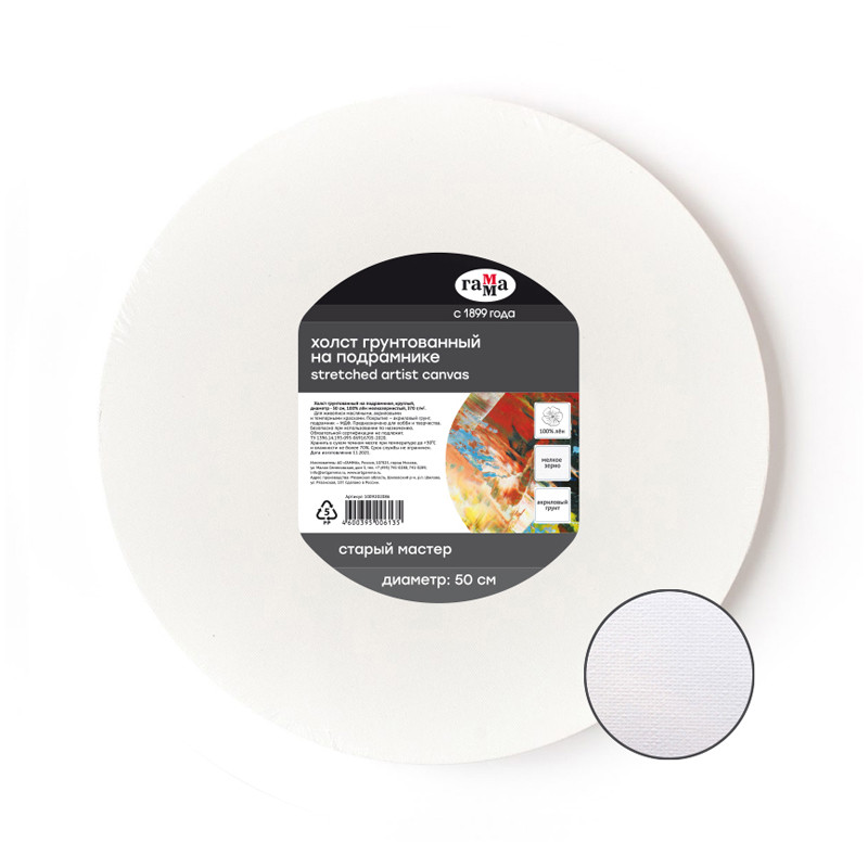 Холст на подрамнике Гамма "Старый Мастер" круглой формы отлично подойдёт для профессиональных художественных работ. Это идеальная основа для масляных, акриловых и темперных краскок. Холст изготовлен из 100% льна высокого качества. Трехслойный акриловый грунт сохраняет чистоту цветов и оттенков. Плотность 370 г / м2 подходит для письма, лессировки, портретов и эскизов. Подрамник выполнен из МДФ с буртиком.