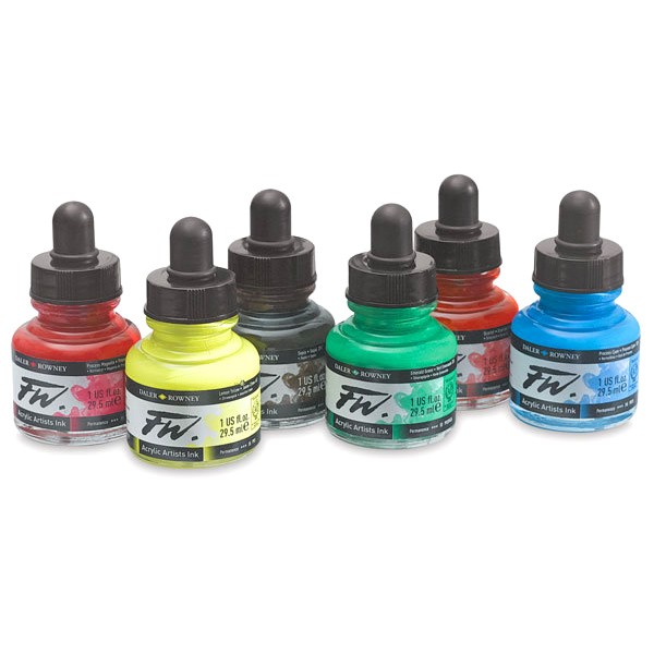 Акриловые чернила "FW Artists’ Ink" от английской компании "Daler Rowney" - это насыщенные, чистые цвета с отличной светостойкостью и прекрасными рабочими свойствами. Палитра чернил "FW Artists’ Ink" состоит из 38 цветов, включая 2 цвета "металлик" и 4 интерферирующих (иридисцентных) состава, создающих под определенным углом зрения цветной перелив. Также коллекцию дополняют 6 флуоресцентных оттенков, однако эти цвета светостойкими не являются. Выпускаются в бутылочках 29.5мл, крышки которых снабжены пипетками. Чернила FW можно использовать прямо из флакона или разбавлять водой для получения легких акварельных тонов. После высыхания чернила образуют водостойкую пленку практически на всех поверхностях (рекомендуется протестировать материал заранее и, возможно, подобрать "грунтовку"). Чернила можно наносить в несколько слоев. Они вполне годятся для традиционной живописи кистью, но наилучшая сфера их применения - аэрографы, перьевые ручки и художественные маркеры. Чернила "FW Artists’ Ink", объединяющие в себе текучесть акрила и чёткость графики, будут идеальным дополнением выразительных средств для любого художника, иллюстратора, дизайнера, каллиграфа и просто творческого человека.