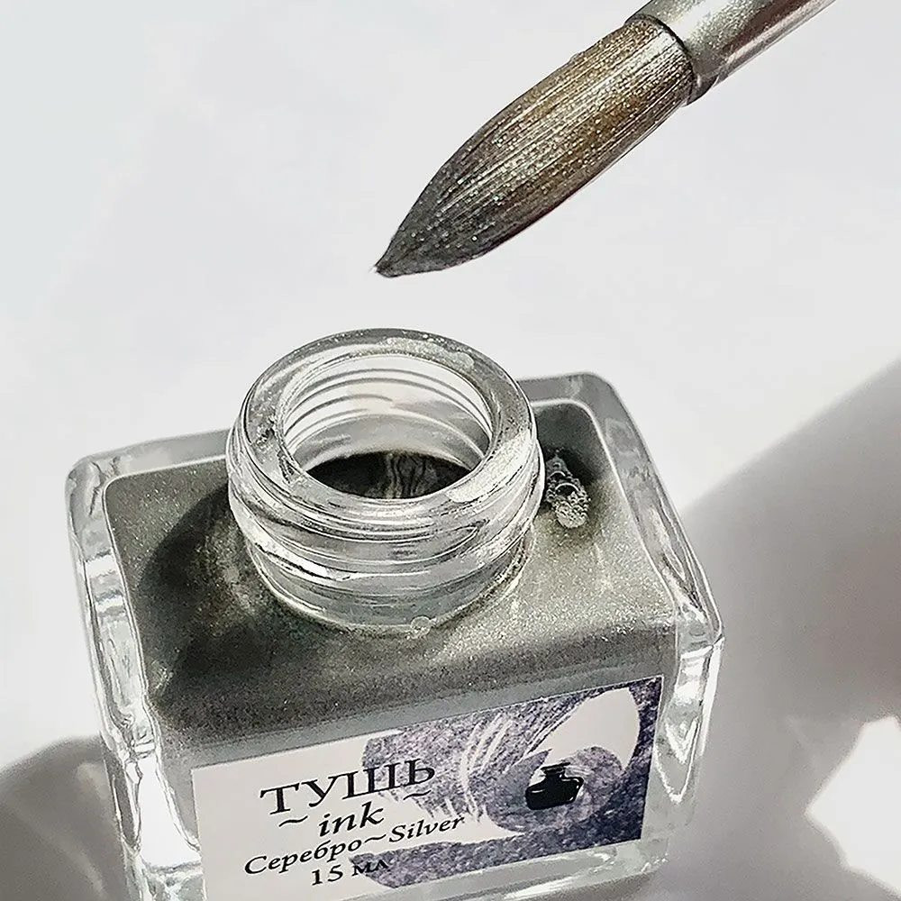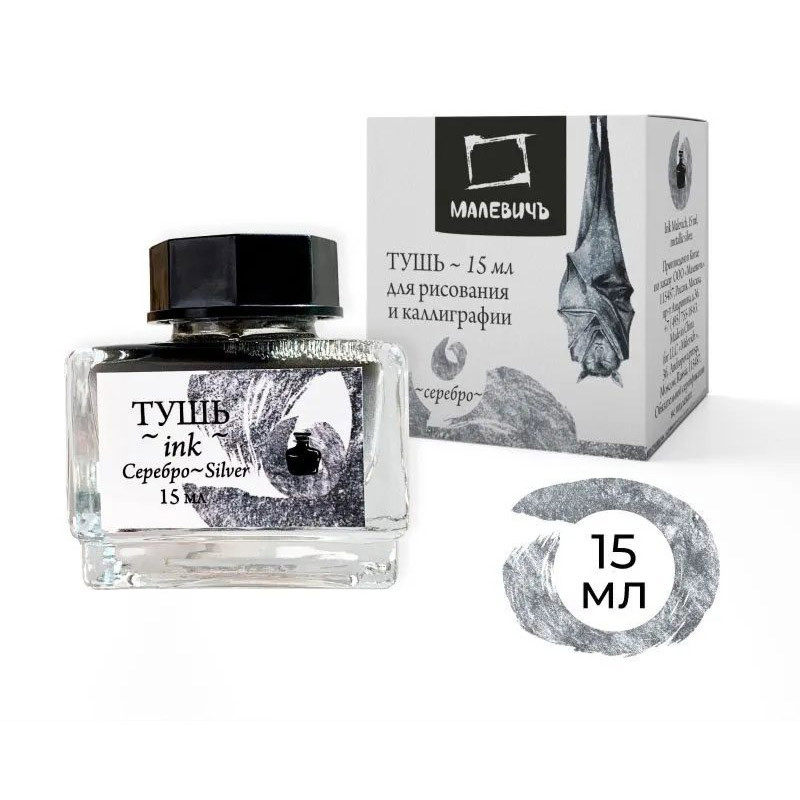 Серебряная тушь для рисования и каллиграфии от Малевичъ это - плотная яркая тушь, в состав которой входят специальная смола и металлическая пудра. Высокая укрывистость и плотная консистенция отлично подходят для работ на черной и тонированной бумаге. После высыхания тушь дает эффект потали. Перед использованием флакон рекомендуется взбалтывать, чтобы металлические частицы распределились равномерно. Герметичность флакона и свежесть туши обеспечивает силиконовая заглушка под крышкой. Серебряные чернила можно использовать с акварелью, выделяя акценты рисунка. Тушь содержит металлическую пудру, поэтому не рекомендуется заправлять ею перьевые ручки и кисти с резервуаром.