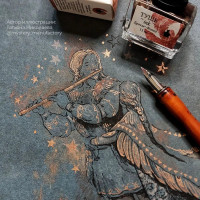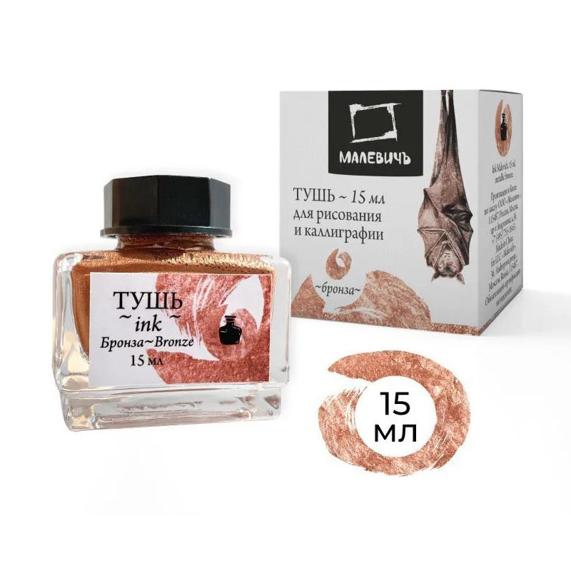Бронзовая тушь для рисования и каллиграфии от Малевичъ это - плотная яркая тушь, в состав которой входят специальная смола и металлическая пудра. Высокая укрывистость и плотная консистенция отлично подходят для работ на черной и тонированной бумаге. После высыхания тушь дает эффект потали. Перед использованием флакон рекомендуется взбалтывать, чтобы металлические частицы распределились равномерно. Герметичность флакона и свежесть туши обеспечивает силиконовая заглушка под крышкой. Бронзовые чернила можно использовать с акварелью, выделяя акценты рисунка. Тушь содержит металлическую пудру, поэтому не рекомендуется заправлять ею перьевые ручки и кисти с резервуаром.
