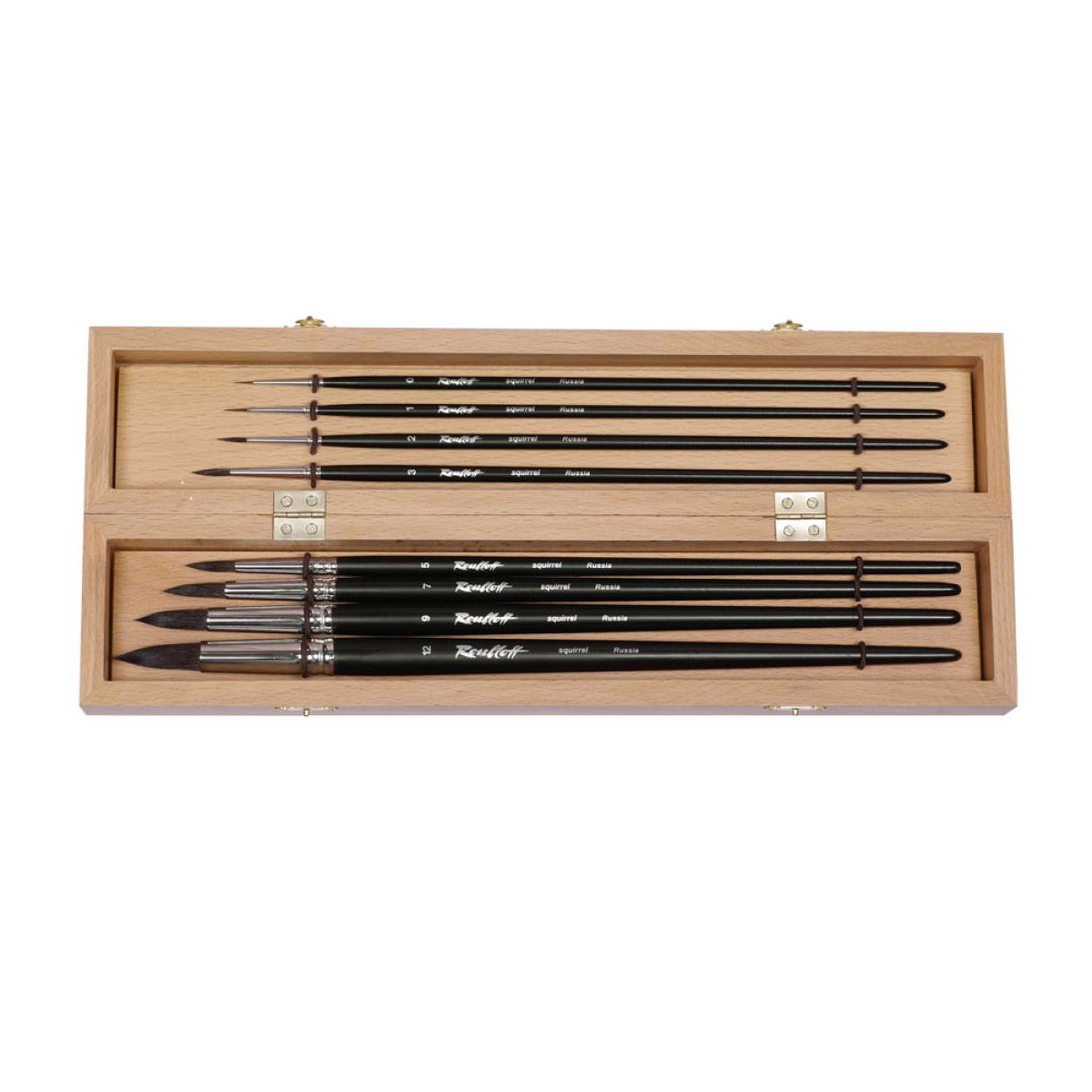 Кисти из волоса белки, 8 штук, круглые, ROUBLOFF, набор №10. Набор круглых кистей из волоса белки является отличным выбором для профессиональной акварельной и миниатюрной живописи, а также для техники холодного батика. Буковый пенал с элегантной застежкой оберегает кисти от внешнего воздействия и удобен в целях переноски изделий на пленэр. Каждая кисть фиксируется эластичной резиночкой в двух местах. Хромированная медная обойма надежно защищает мягкие ворсинки и прочно скрепляет с черной длинной ручкой. Универсальность формы пучка в виде конуса с идеальным зауженным кончиком позволяет наносить живописные мазки и моделировать объем средних и крупных объектов, а также вести тонкую изящную линию, выполнять деталировку переднего плана композиции. Данных кистей достаточно для полноценной работы, где могут быть изображены цветочные, ботанические и орнаментальные мотивы, городские улочки с архитектурными постройками. В наборе представлены номера: 0, 1, 2, 3, 5, 7, 9, 12.