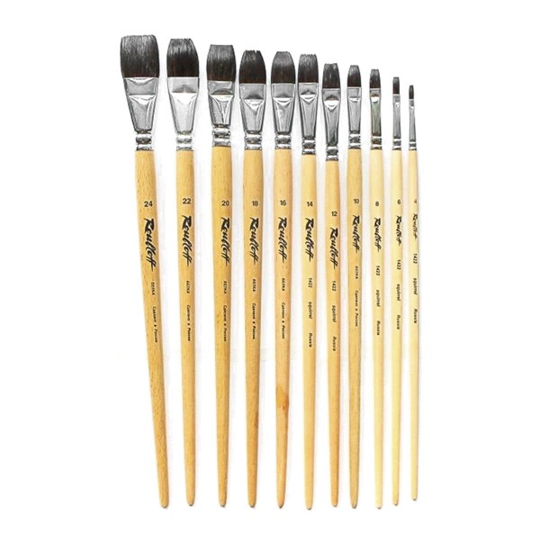 Плоская кисть "Roubloff" из волоса белки. Волос белки очень тонок, мягок и упруг, что делает эту кисть идеальной для работы в акварельной технике. У ворса отличная впитываемость и, одновременно с этим, отдача влаги. Ручная обработка волоса. Медная хромированная (серебристая) обойма. Длинная ручка из древесины березы, прозрачный лак. Плоская кисть используется для нанесения фона, выполнения колеровки, прорисовки краеугольных форм и прямых линий. Идеальна для покрытия краской больших площадей, закрашивания фона.