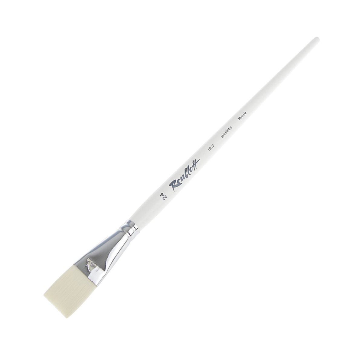 Плоская кисть "Roubloff" из белого синтетического ворса прекрасно располагается в руке за счет сбалансированной длины. Хромированная медная обойма надежно защищает ворсинки изделия и прочно скрепляет с белой глянцевой ручкой. Такой цвет волоса позволяет более точно отслеживать чистоту оттенка краски, что увеличивает качество работы с точки зрения колористики, а новый подход к технологии создания синтетики увеличил эластичность и упругость материала. Прямоугольная форма кисти позволяет работать с заливками широкими полосами, а также изображать архитектурные строения и наносить структурные пятна.