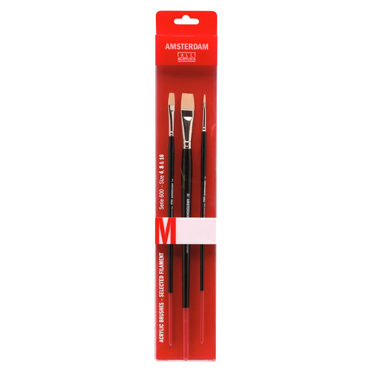Кисти "Амстердам" от голландской компании Royal Talens для акрила изготовлены из синтетического материала отличного качества. Кисти идеально подходят для акрила, поскольку их упругость и эластичность прекрасно сочетаются с пастообразным характером этих красок. Синтетический волос кистей - долговечен, сохраняет свою форму во время использования, стоек к растворителям. Это делает кисти "Амстердам" подходящими и для других типов краски. Высококачественная обойма изготовлена из никелированной латуни. Ручка - деревянная, длинная, лакированная, цвет - черный глянцевый с красным. Набор кистей "Amsterdam" серии 600 для акрила и масла состоит из 3шт. плоских кистей: №4, №8, №16.