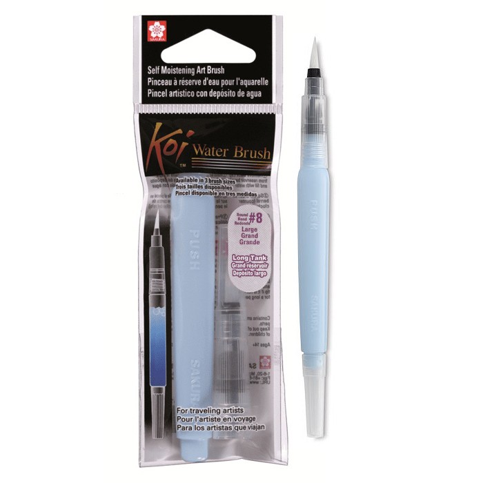 Кисть водная с резервуаром 9мл (№8 - большая) из коллекции "Koi" от японской фирмы "Sakura" является удобной альтернативой классическим кисточкам. Корпус ручки наполняется водой и, после нажатия, вода поступает между волокон кисти, что равноценно обмакиванию обычной кисти в воду. Корпус - прозрачен и, при необходимости, может быть снова заполнен. Ворс кистей - синтетика с силиконовой пропиткой. Уникальность кисточки состоит в том, что её не обязательно мыть, достаточно лишь протереть сухой салфеткой. Толстая водная кисть №8 идеальна для работ над большими пространствами, однако острый кончик позволяет работать и над деталями. Подходит для "мокрых техник" живописи, а также для различных видов хобби.