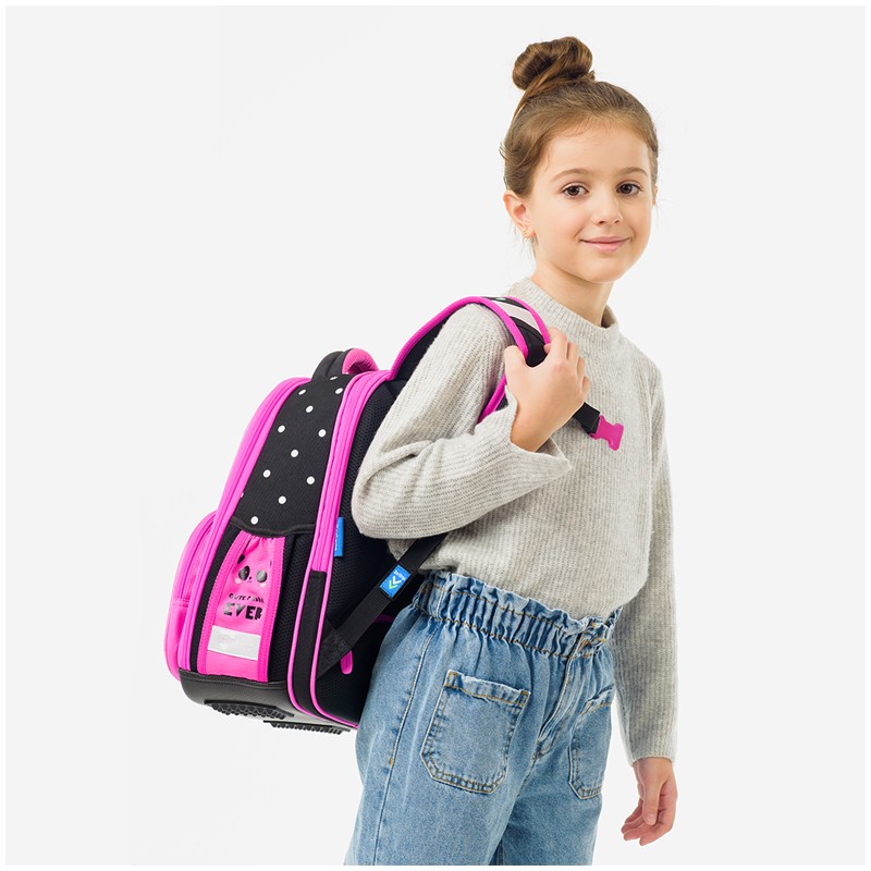 Эргономичный ранец серии "Profi" предназначен для детей младшего школьного возраста. Он выполнен из легкого экологичного ЭВА материала с покрытием из высокопрочной нейлоновой ткани кордура. За счет особой структуры нити в ней достигнута четырёхкратная стойкость к истиранию по сравнению с простым нейлоном. Кордура обладает водоотталкивающими свойствами и легко чистится. Благодаря анатомической вентилируемой спинке, регулируемым по длине и высоте лямкам и нагрудному креплению ранец плотно фиксируется на спине ребенка, что помогает равномерно распределить нагрузку и сохранить правильную осанку. Ранец имеет 2 отделения, 1 передний карман на молнии, 2 боковых кармана на резинке, "потайной" карман на молнии на спинке. Внутри предусмотрены разделители для учебных пособий и именная карточка для подписи. Отделение у спинки предназначено для учебных пособий формата А4+. Уплотненная мягкая ручка и петля для подвешивания к парте делают ранец очень удобным. Дно выполнено из водонепроницаемого ПВХ с пластиковыми ножками. Световозвращающие элементы на лямках, передней и боковых частях ранца обеспечивают безопасность ребенка в темное время суток. Размер - 360*280*180 мм. Объем - 16 л, вес - 950 г. Толщина спинки - 5-20 мм. Толщина дна - 7 мм. Ширина лямок - 65 мм, толщина лямок - 5 мм. Возрастная группа - для младших классов. Для девочек.