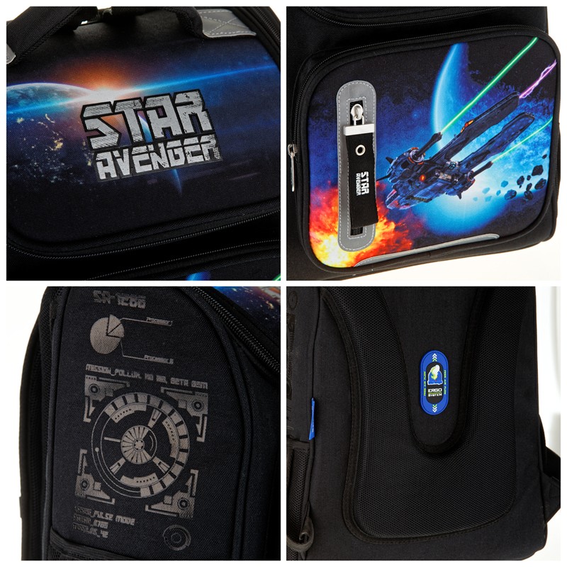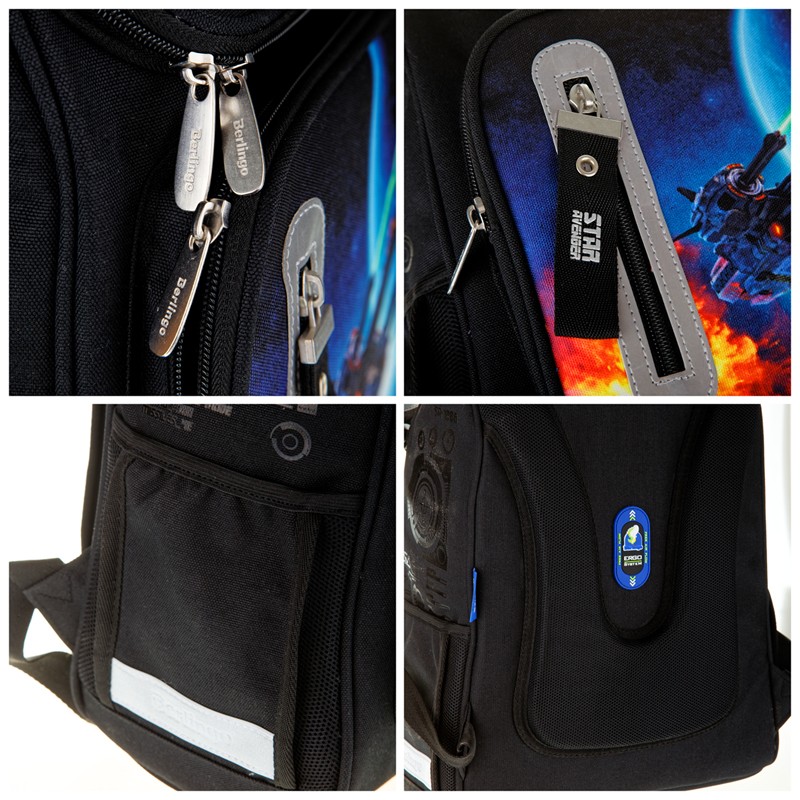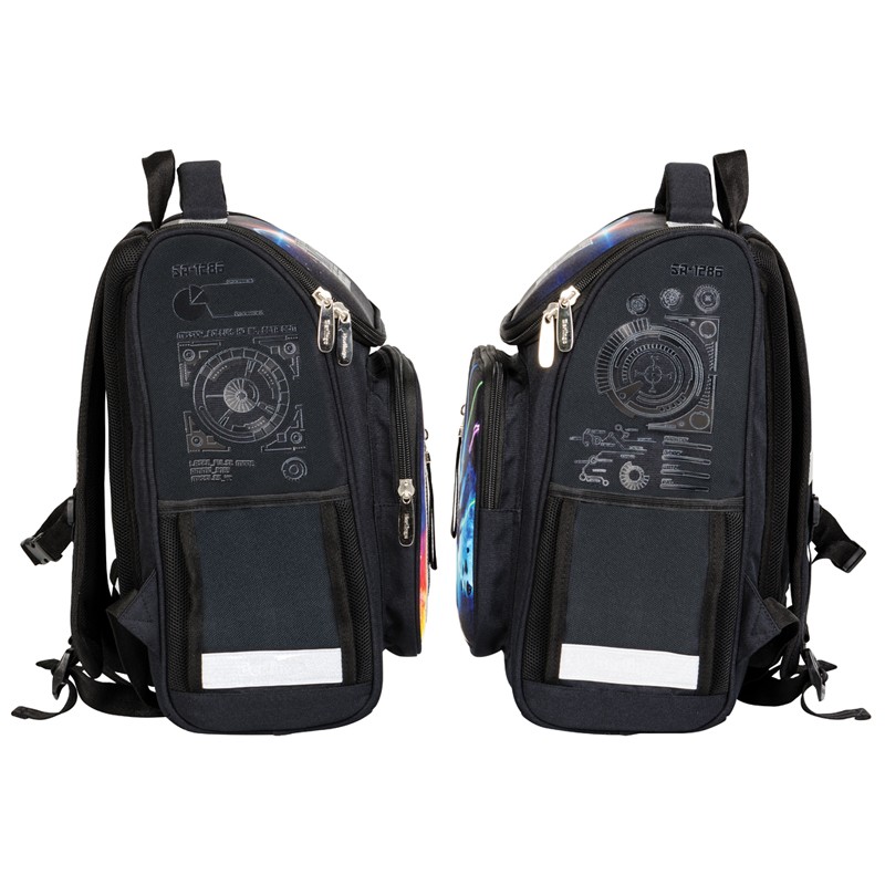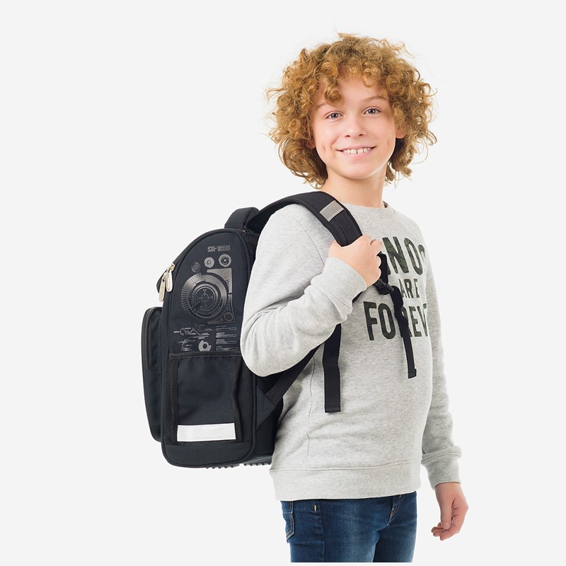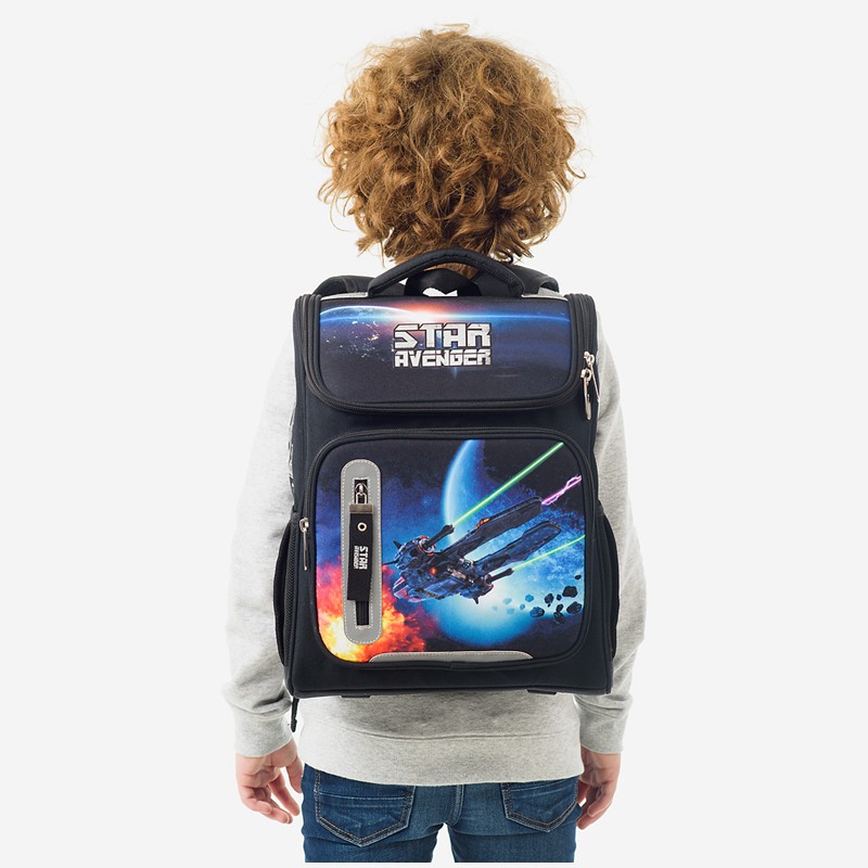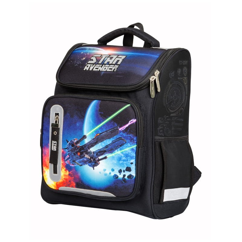 Классический облегченный ранец рассчитан на учеников младшей и средней школы. Благодаря эргономичной вентилируемой спинке, а также регулируемым по длине и высоте лямкам, нагрудному креплению он плотно фиксируется на спине ребенка. В ранце предусмотрены 1 отделение, 1 передний карман на молнии с небольшим кармашком, 2 боковых кармана. Внутри имеются органайзер, 2 отделения для учебных пособий и именная карточка. Пластиковые ножки на дне защищают его от загрязнений. Ранец оснащен плотной ручкой и петлей для подвешивания. Световозвращающие элементы расположены на передней части, сбоку и на лямках. Размер - 370*290*180 мм. Объем - 19 л, вес - 850 г. Толщина спинки - 10 мм. Толщина дна - 8 мм. Ширина лямок - 70 мм, толщина лямок - 8 мм. Возрастная группа - для младших и средних классов. Для мальчиков.