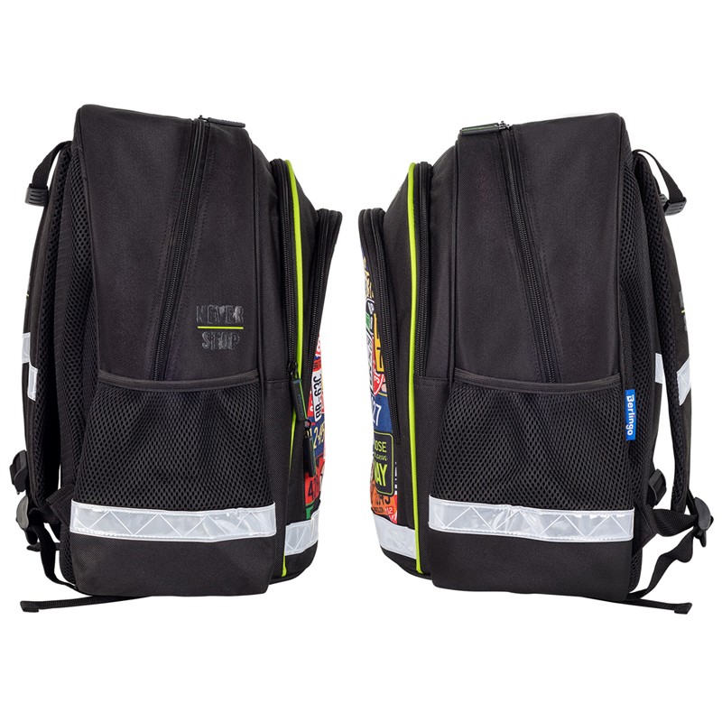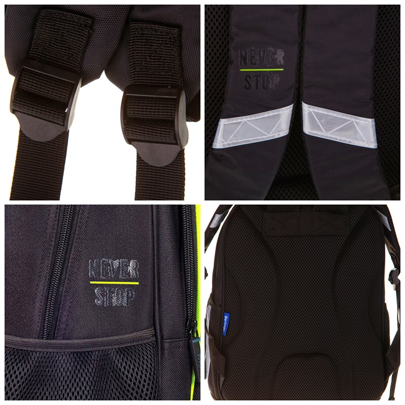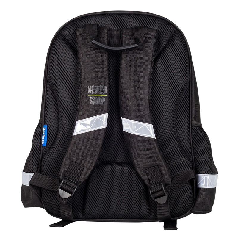 Рюкзак из прочного материала, благодаря чему, он обладает повышенной износостойкостью. В рюкзаке предусмотрено 2 отделения, 1 передний и 2 боковых кармана. Жесткая эргономичная вентилируемая спинка и широкие регулируемые лямки помогают равномерному распределению нагрузки на позвоночник. На ручке имеется специальная пластиковая накладка, которая обеспечивает дополнительную прочность. Внутренняя подкладка плотная и устойчивая к разрывам. Дно рюкзака оснащено пластиковыми ножками для защиты от загрязнений. На лямках, передней части рюкзака и боковых карманах расположены световозвращающие элементы, которые помогают обеспечивать безопасность в темное время суток. Размер - 390*290*200мм. Объем - 22 л, вес - 610 г. Толщина спинки - 7-15 мм. Толщина лямок - 10 мм. Толщина дна - 5 мм. Возрастная группа - для младших и средних классов. Для мальчиков.