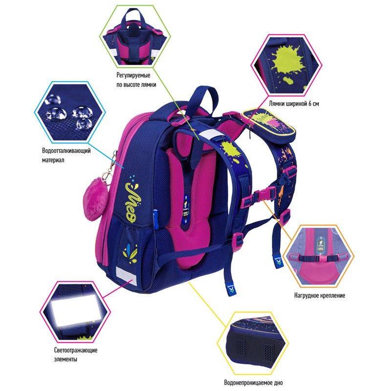 Эргономичный ранец серии Expert для детей младшего и среднего школьного возраста выполнен из экологичного ЭВА материала с покрытием из высокопрочной нейлоновой ткани кордура. За счет особой структуры нити в ней достигнута четырёхкратная стойкость к истиранию по сравнению с простым нейлоном. Кордура обладает водоотталкивающими свойствами и легко чистится. Благодаря анатомической вентилируемой спинке, регулируемым по длине и высоте лямкам, а также нагрудному креплению ранец плотно фиксируется на спине ребенка, что помогает равномерно распределить нагрузку и сохранить правильную осанку. Ранец имеет 2 отделения, 2 боковых кармана на резинке, съемный кошелек на лямке для быстрого доступа к необходимым вещам. Внутри предусмотрены разделители для учебных пособий, органайзер для письменных принадлежностей, карман для мобильного телефона, карабин для ключей и именная карточка для подписи. Уплотненная мягкая ручка и петля для подвешивания к парте делают ранец очень удобным. Дно выполнено из водонепроницаемого материала с пластиковыми ножками для защиты от влаги. Световозвращающие элементы на лямках, передней и боковых частях ранца обеспечивают безопасность ребенка в темное время суток. Подвеска в подарок. Вес ранца менее 1 кг. Размер - 37х28х16см. Объем - 16.5л, вес - 990г. Толщина спинки - 5-25мм. Толщина лямок - 10мм. Толщина дна - 7мм. Возрастная группа - для младших и средних классов. Для девочек.