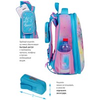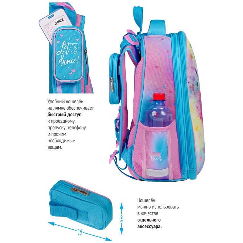 Эргономичный ранец серии Expert для детей младшего и среднего школьного возраста выполнен из экологичного ЭВА материала с покрытием из высокопрочной нейлоновой ткани кордура. За счет особой структуры нити в ней достигнута четырёхкратная стойкость к истиранию по сравнению с простым нейлоном. Кордура обладает водоотталкивающими свойствами и легко чистится. Благодаря анатомической вентилируемой спинке, регулируемым по длине и высоте лямкам, а также нагрудному креплению ранец плотно фиксируется на спине ребенка, что помогает равномерно распределить нагрузку и сохранить правильную осанку. Ранец имеет 2 отделения, 2 боковых кармана на резинке, съемный кошелек на лямке для быстрого доступа к необходимым вещам. Внутри предусмотрены разделители для учебных пособий, органайзер для письменных принадлежностей, карман для мобильного телефона, карабин для ключей и именная карточка для подписи. Уплотненная мягкая ручка и петля для подвешивания к парте делают ранец очень удобным. Дно выполнено из водонепроницаемого материала с пластиковыми ножками для защиты от влаги. Световозвращающие элементы на лямках, передней и боковых частях ранца обеспечивают безопасность ребенка в темное время суток. Подвеска в подарок. Вес ранца менее 1 кг. Размер - 37х28х16см. Объем - 16.5л, вес - 990г. Толщина спинки - 5-25мм. Толщина лямок - 10мм. Толщина дна - 7мм. Возрастная группа - для младших и средних классов. Для девочек.