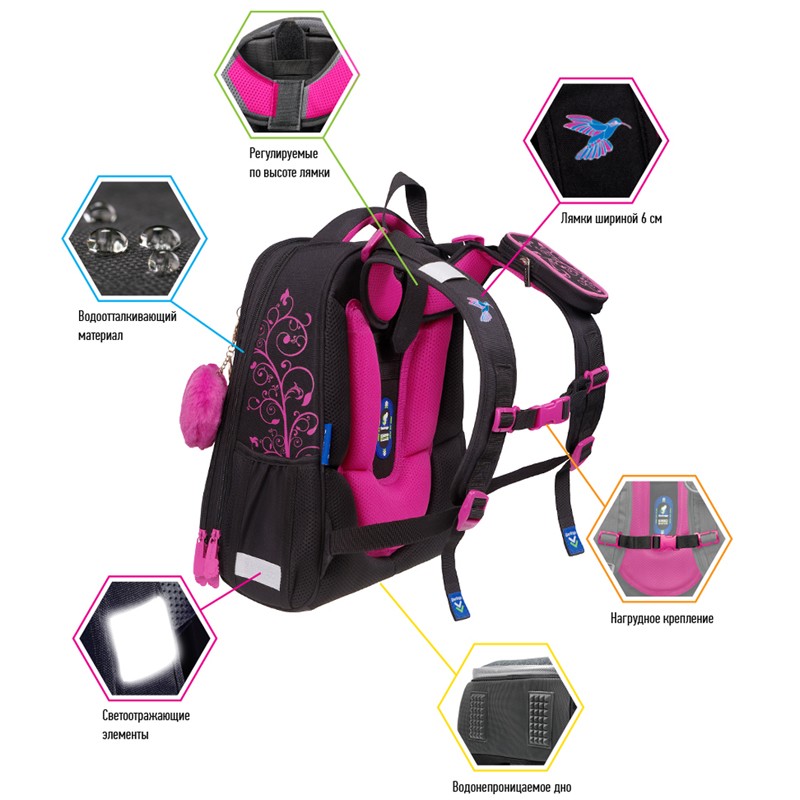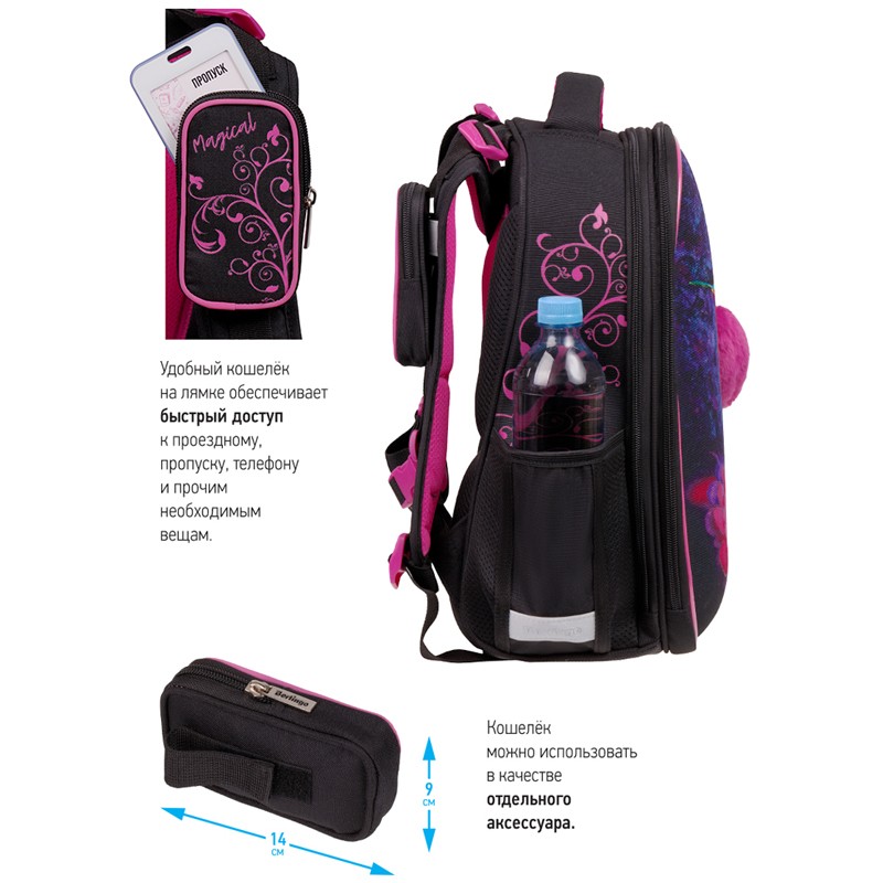 Эргономичный ранец серии Expert для детей младшего и среднего школьного возраста выполнен из экологичного ЭВА материала с покрытием из высокопрочной нейлоновой ткани кордура. За счет особой структуры нити в ней достигнута четырёхкратная стойкость к истиранию по сравнению с простым нейлоном. Кордура обладает водоотталкивающими свойствами и легко чистится. Благодаря анатомической вентилируемой спинке, регулируемым по длине и высоте лямкам, а также нагрудному креплению ранец плотно фиксируется на спине ребенка, что помогает равномерно распределить нагрузку и сохранить правильную осанку. Ранец имеет 2 отделения, 2 боковых кармана на резинке, съемный кошелек на лямке для быстрого доступа к необходимым вещам. Внутри предусмотрены разделители для учебных пособий, органайзер для письменных принадлежностей, карман для мобильного телефона, карабин для ключей и именная карточка для подписи. Уплотненная мягкая ручка и петля для подвешивания к парте делают ранец очень удобным. Дно выполнено из водонепроницаемого материала с пластиковыми ножками для защиты от влаги. Световозвращающие элементы на лямках, передней и боковых частях ранца обеспечивают безопасность ребенка в темное время суток. Подвеска в подарок. Вес ранца менее 1 кг. Размер - 37х28х16см. Объем - 16.5л, вес - 990г. Толщина спинки - 5-25мм. Толщина лямок - 10мм. Толщина дна - 7мм. Возрастная группа - для младших и средних классов. Для девочек.