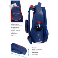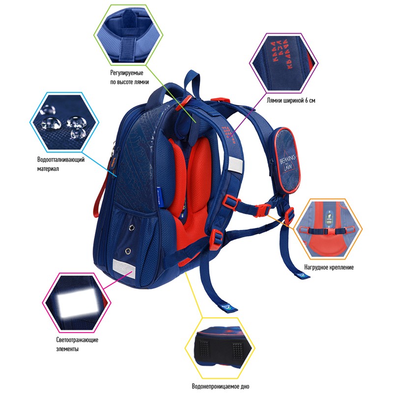 Эргономичный ранец серии Expert Max для детей младшего и среднего школьного возраста выполнен из экологичного ЭВА материала с покрытием из высокопрочной нейлоновой ткани кордура. За счет особой структуры нити в ней достигнута четырёхкратная стойкость к истиранию по сравнению с простым нейлоном. Кордура обладает водоотталкивающими свойствами и легко чистится. Благодаря анатомической вентилируемой спинке, регулируемым по длине и высоте лямкам, а также нагрудному креплению ранец плотно фиксируется на спине ребенка, что помогает равномерно распределить нагрузку и сохранить правильную осанку. Ранец имеет 2 отделения, 2 боковых кармана на резинке, съемный кошелек на лямке для быстрого доступа к необходимым вещам. Внутри предусмотрены разделители для учебных пособий, органайзер для письменных принадлежностей, карман для мобильного телефона, карабин для ключей и именная карточка для подписи. Уплотненная мягкая ручка и петля для подвешивания к парте делают ранец очень удобным. Дно выполнено из водонепроницаемого материала с пластиковыми ножками для защиты от влаги. Световозвращающие элементы на лямках, передней и боковых частях ранца обеспечивают безопасность ребенка в темное время суток. Особенностью данной модели является наличие дождевика, расположенного в специальном кармашке в вехней части ранца. Дождевик оснащен светоотражающими элементами. Подавеска в подарок. Размер - 37х28х16см. Объем - 16.5л, вес - 1000г. Толщина спинки - 5-25мм. Толщина лямок - 10мм. Толщина дна - 7мм. Возрастная группа - для младших и средних классов. Для мальчиков.