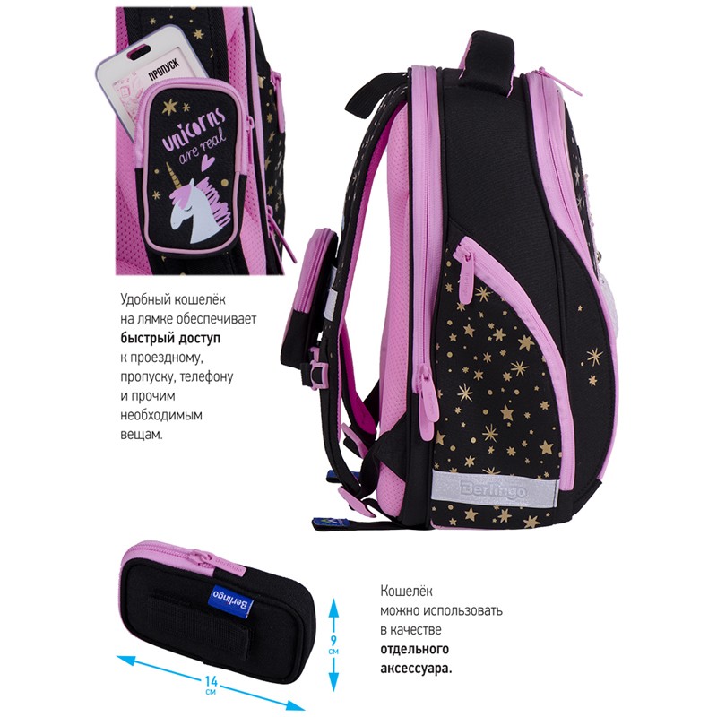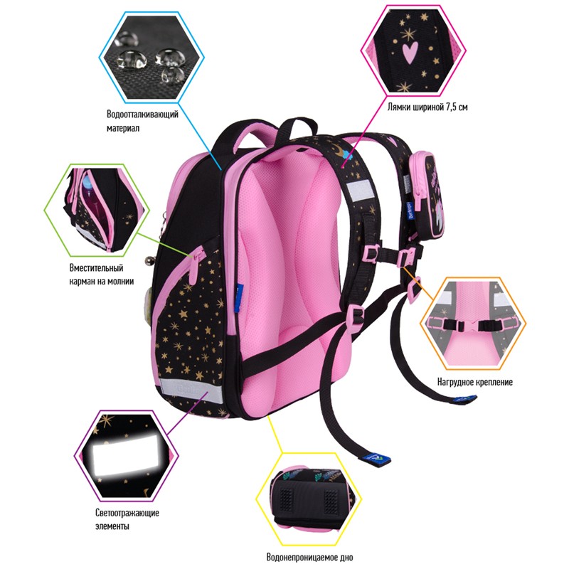Эргономичный ранец серии Nova для детей младшего и среднего школьного возраста выполнен из легкого экологичного ЭВА материала с покрытием из высокопрочной нейлоновой ткани кордура. За счет особой структуры нити в ней достигнута четырёхкратная стойкость к истиранию по сравнению с простым нейлоном. Кордура обладает водоотталкивающими свойствами и легко чистится. Благодаря анатомической вентилируемой спинке, регулируемым по длине лямкам и нагрудному креплению ранец плотно фиксируется на спине ребенка, что помогает равномерно распределить нагрузку и сохранить правильную осанку. Ранец имеет 2 отделения, 2 боковых кармана на молнии, съемный кошелек на лямке для быстрого доступа к необходимым вещам. Внутри предусмотрены разделители для учебных пособий, органайзер для письменных принадлежностей, карман для мобильного телефона, карабин для ключей и именная карточка для подписи. Отделение у спинки предназначено для учебных пособий формата А4+. Уплотненная мягкая ручка и петля для подвешивания к парте делают ранец очень удобным. Дно выполнено из водонепроницаемого материала с пластиковыми ножками для защиты содержимого от влаги. Световозвращающие элементы на лямках, передней и боковых частях ранца обеспечивают безопасность ребенка в темное время суток. Подвеска в подарок. Вес ранца менее 1 кг. Размер - 37х28х18см. Объем - 17л, вес - 895г. Толщина спинки - 5-20мм. Толщина лямок - 10мм. Толщина дна - 7мм. Возрастная группа - для младших и средних классов. Для девочек.