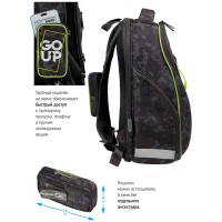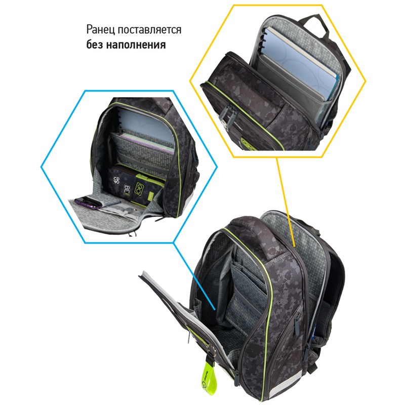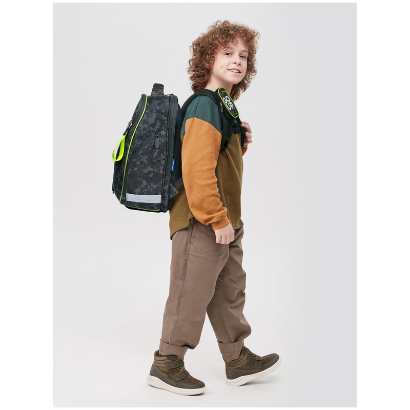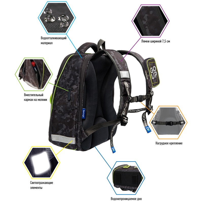 Эргономичный ранец серии Nova для детей младшего и среднего школьного возраста выполнен из легкого экологичного ЭВА материала с покрытием из высокопрочной нейлоновой ткани кордура. За счет особой структуры нити в ней достигнута четырёхкратная стойкость к истиранию по сравнению с простым нейлоном. Кордура обладает водоотталкивающими свойствами и легко чистится. Благодаря анатомической вентилируемой спинке, регулируемым по длине лямкам и нагрудному креплению ранец плотно фиксируется на спине ребенка, что помогает равномерно распределить нагрузку и сохранить правильную осанку. Ранец имеет 2 отделения, 2 боковых кармана на молнии, съемный кошелек на лямке для быстрого доступа к необходимым вещам. Внутри предусмотрены разделители для учебных пособий, органайзер для письменных принадлежностей, карман для мобильного телефона, карабин для ключей и именная карточка для подписи. Отделение у спинки предназначено для учебных пособий формата А4+. Уплотненная мягкая ручка и петля для подвешивания к парте делают ранец очень удобным. Дно выполнено из водонепроницаемого материала с пластиковыми ножками для защиты содержимого от влаги. Световозвращающие элементы на лямках, передней и боковых частях ранца обеспечивают безопасность ребенка в темное время суток. Комплект запасных резиновых патчей на липучке (2 шт) и подвеска в подарок. Вес ранца менее 1 кг. Размер - 37х28х18см. Объем - 17л, вес - 950г. Толщина спинки - 5-20мм. Толщина лямок - 10мм. Толщина дна - 7мм. Возрастная группа - для младших и средних классов. Для мальчиков.