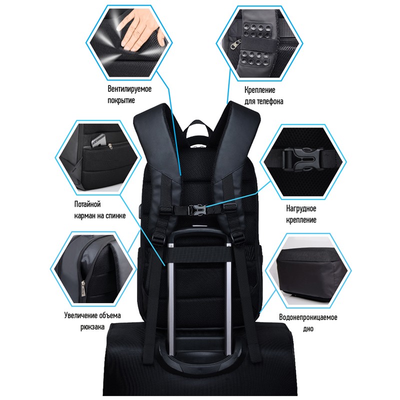 Антивандальный рюкзак серии Antitheft выполнен из высокопрочного полиэстера. Имеет 1 отделение, 1 скрытый карман на спинке, дополнительную молнию, позволяющую увеличить объем рюкзака. Внутри основного отделения - карман для ноутбука, 4 небольших кармана, 1 карман на молнии и выход для USB устройства. Рюкзак имеет эргономичную вентилируемую спинку, регулируемые лямки, ручку для носки, лямку для крепления на чемодан. Размер - 46х31х18см. Объем - 25.5л, вес - 970г. Толщина спинки - 15мм. Толщина лямок - 10мм. Толщина дна - 5мм. Возрастная группа - для средних и старших классов. Для мальчиков.