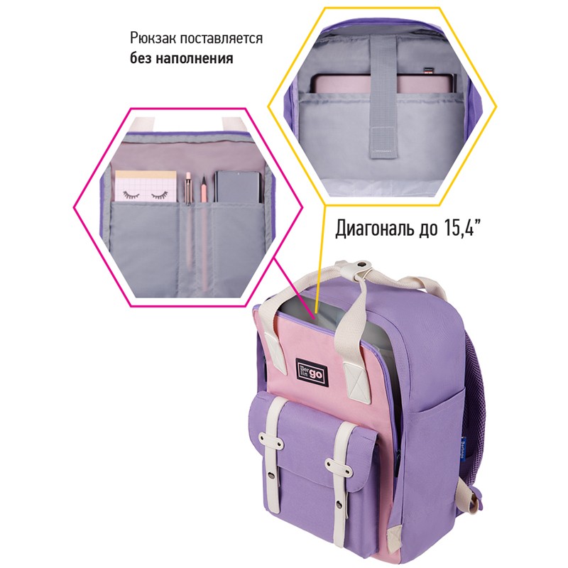Рюкзак выполнен из полиэстера высокого качества плотностью 600D. В модели предусмотрены 1 отделение, 1 передний карман, 2 боковых кармана, 2 плотные ручки с металлической кнопкой для большего удобства. Благодаря усиленному дну и плотной внутренней подкладке он устойчив к разрывам и обладает повышенной износостойкостью. Спинка рюкзака – уплотненная, а лямки – широкие и удобные, что делает его использование максимально комфортным. Размер - 41х29х13см. Объем - 23л, вес - 570г. Толщина спинки - 7мм. Толщина лямок - 10мм. Толщина дна - 2мм. Возрастная группа - для средних и старших классов. Для девочек.