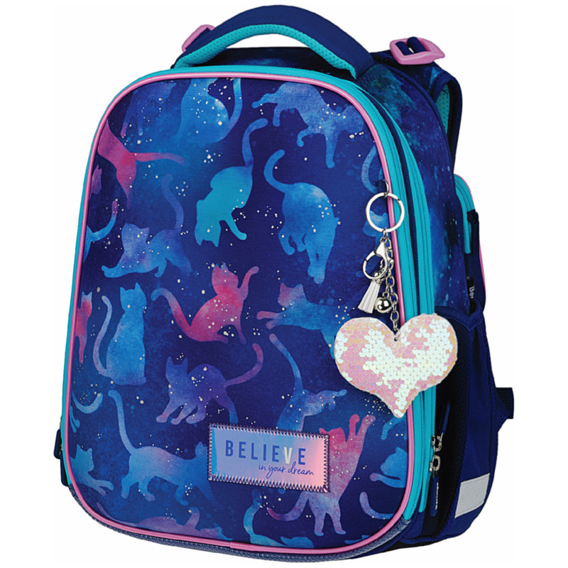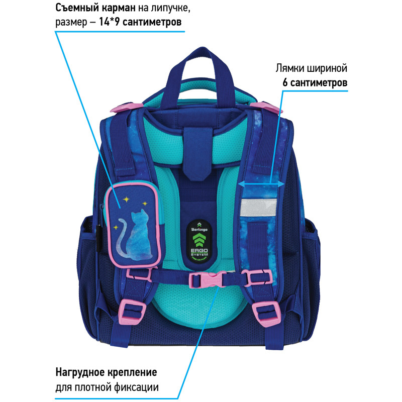 Ранец для школы имеет 2 отделения, 2 боковых кармана на резинке, съемный кошелек на лямке для быстрого доступа к необходимым вещам. Внутри предусмотрены разделители для учебных пособий, органайзер для письменных принадлежностей, карман для мобильного телефона, карабин для ключей и именная карточка для подписи. Уплотненная мягкая ручка и петля для подвешивания к парте делают ранец очень удобным. Дно выполнено из водонепроницаемого материала с пластиковыми ножками для защиты от влаги. Световозвращающие элементы на лямках, передней и боковых частях ранца обеспечивают безопасность ребенка в темное время суток. Подвеска в подарок.