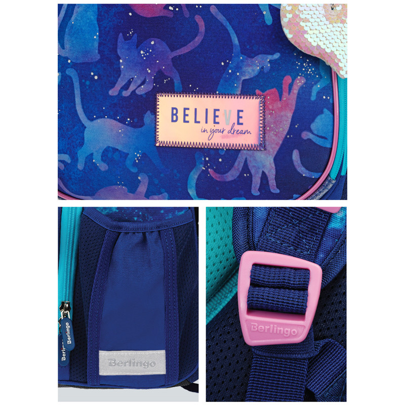 За счет особой структуры нити в ткани достигнута четырёхкратная стойкость к истиранию по сравнению с простым нейлоном. Кордура обладает водоотталкивающими свойствами и легко чистится. Благодаря анатомической вентилируемой спинке, регулируемым по длине и высоте лямкам, а также нагрудному креплению ранец плотно фиксируется на спине ребенка, что помогает равномерно распределить нагрузку и сохранить правильную осанку.