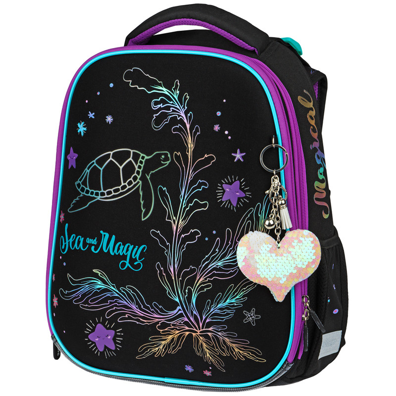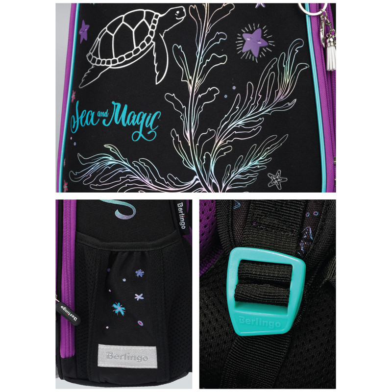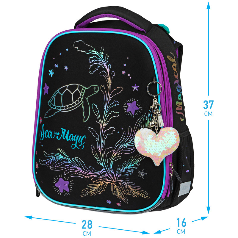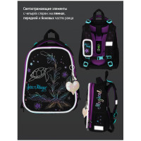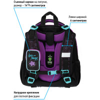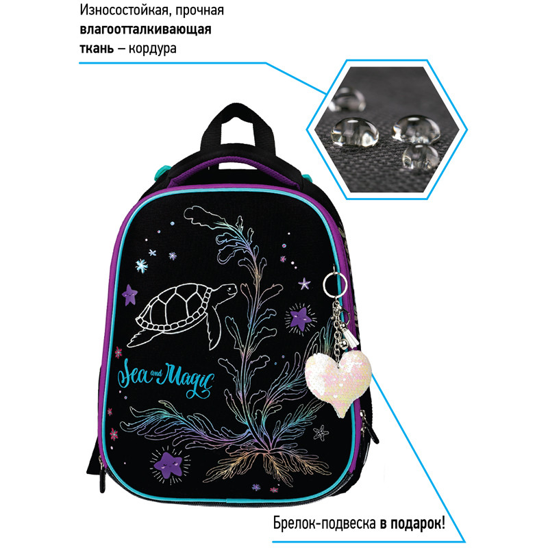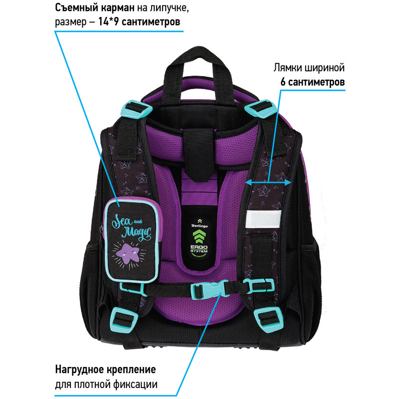 Ранец для школы имеет 2 отделения, 2 боковых кармана на резинке, съемный кошелек на лямке для быстрого доступа к необходимым вещам. Внутри предусмотрены разделители для учебных пособий, органайзер для письменных принадлежностей, карман для мобильного телефона, карабин для ключей и именная карточка для подписи. Уплотненная мягкая ручка и петля для подвешивания к парте делают ранец очень удобным. Дно выполнено из водонепроницаемого материала с пластиковыми ножками для защиты от влаги. Световозвращающие элементы на лямках, передней и боковых частях ранца обеспечивают безопасность ребенка в темное время суток. Подвеска в подарок.