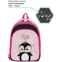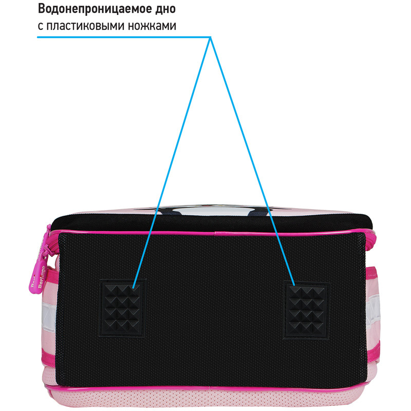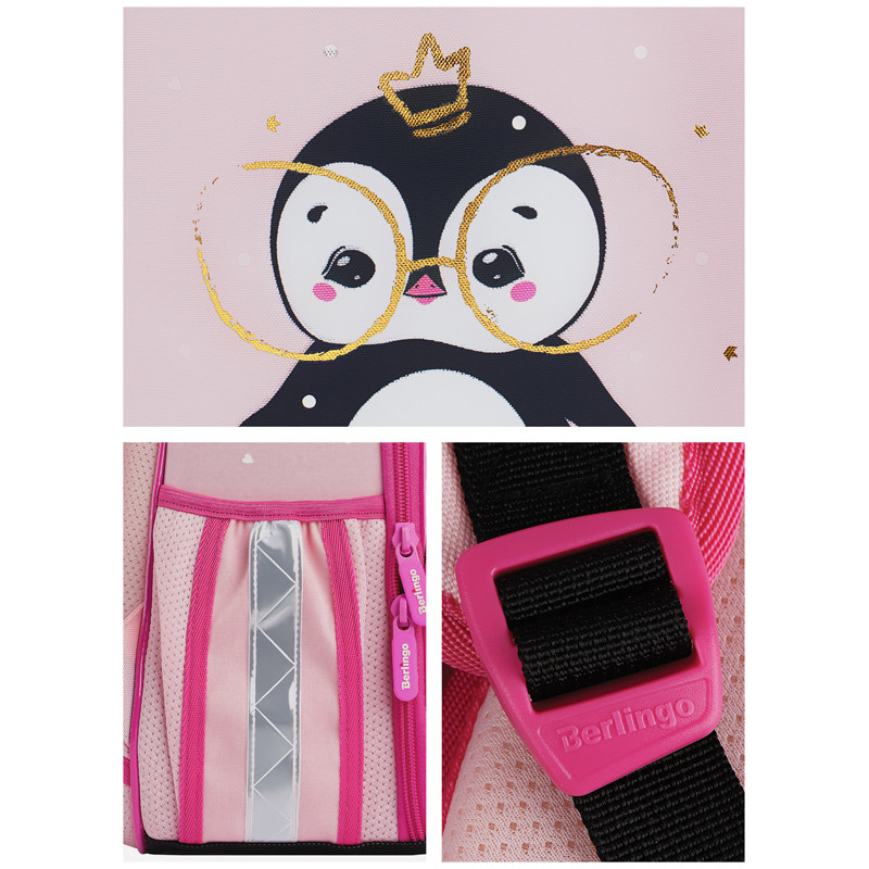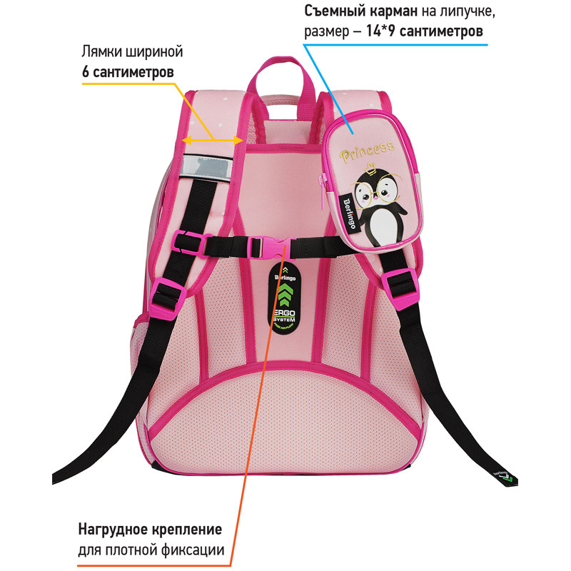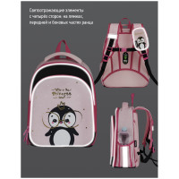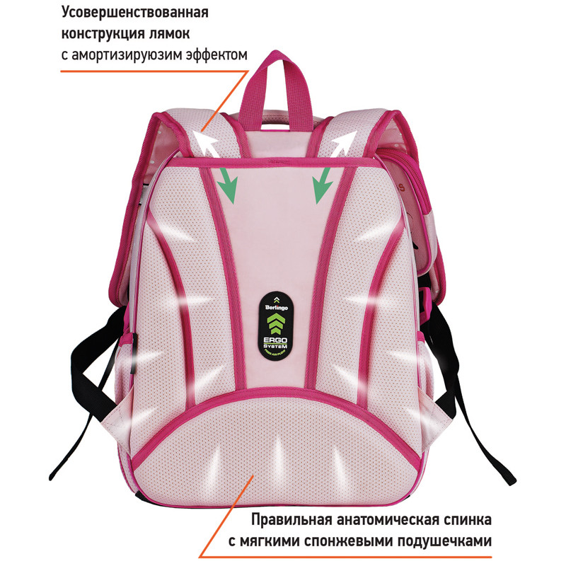Благодаря анатомической вентилируемой спинке, а также регулируемым по длине лямкам и нагрудному креплению ранец плотно фиксируется на спине ребенка, равномерно распределяется нагрузка и сохраняется правильная осанка. Ранец оснащен усовершенствованной конструкцией лямок с амортизирующим эффектом, которая помогает снизить нагрузку на плечи и спину ребенка. Дно выполнено из водонепроницаемого материала и оснащено пластиковыми ножками для защиты содержимого от влаги. Ранец оснащен плотной ручкой и петлей для подвешивания. Световозвращающие элементы на лямках, передней и боковой частях ранца обеспечивают безопасность в темное время суток. Вес 1 кг.