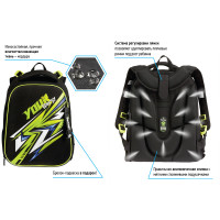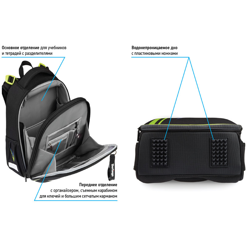 Ранец объёмом 16,5 литров имеет 2 отделения, 2 боковых кармана на резинке, съемный кошелек на лямке для быстрого доступа к необходимым вещам. Внутри предусмотрены разделители для учебных пособий, органайзер для письменных принадлежностей, карман для мобильного телефона, карабин для ключей и именная карточка для подписи.