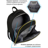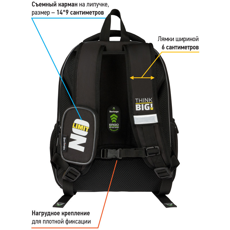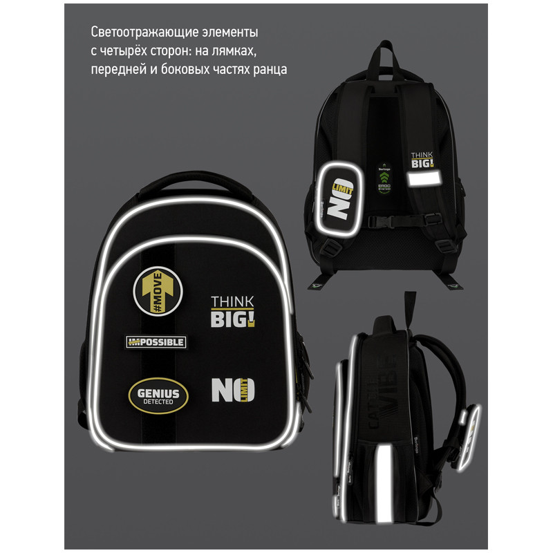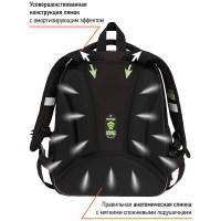 Благодаря анатомической вентилируемой спинке, а также регулируемым по длине лямкам и нагрудному креплению ранец плотно фиксируется на спине ребенка, равномерно распределяется нагрузка и сохраняется правильная осанка. Ранец оснащен усовершенствованной конструкцией лямок с амортизирующим эффектом, которая помогает снизить нагрузку на плечи и спину ребенка. Дно выполнено из водонепроницаемого материала и оснащено пластиковыми ножками для защиты содержимого от влаги. Ранец оснащен плотной ручкой и петлей для подвешивания. Световозвращающие элементы на лямках, передней и боковой частях ранца обеспечивают безопасность в темное время суток. Вес 1 кг.