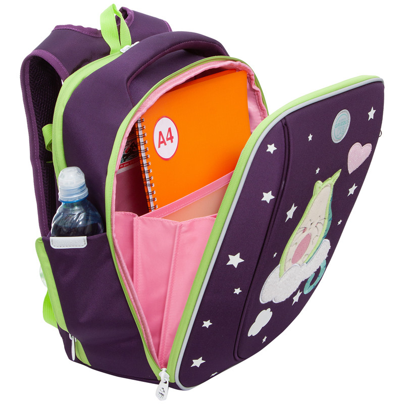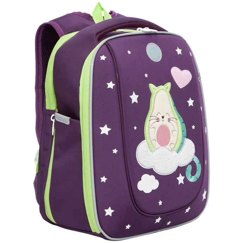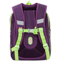 Школьный рюкзак GRIZZLY, два отделения, боковые карманы на молнии, разделительная перегородка-органайзер, внутренний карман на молнии, жесткая анатомическая спинка, дополнительная ручка-петля, мягкая укрепленная ручка, нагрудная стяжка-фиксатор, укрепленные лямки, помещается А4, светоотражающие элементы с четырех сторон, держатель для школьной карты. Материал изделия - полиэстер. Размер - 290*360*180 мм, объем - 13 л. Вес - 981 г. Толщина спинки - 15 мм. Толщина лямок - 10 мм. Ширина лямок - 70 мм. Толщина дна - 5 мм.