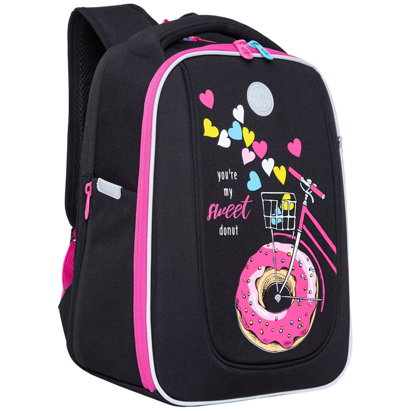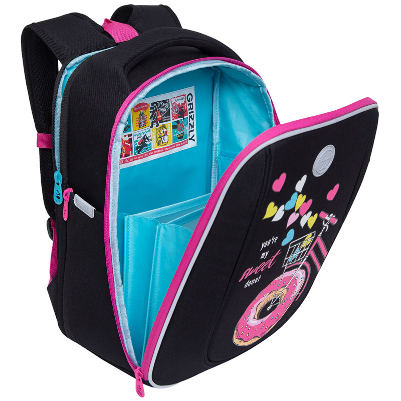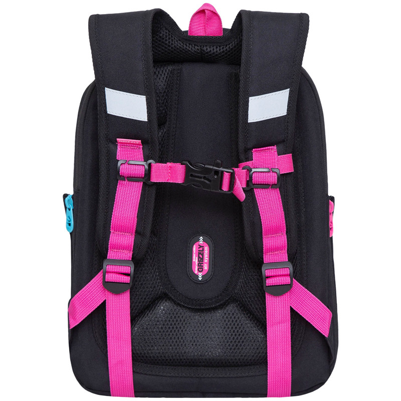 Школьный рюкзак GRIZZLY, два отделения, боковые карманы на молнии, разделительная перегородка-органайзер, внутренний карман на молнии, жесткая анатомическая спинка, дополнительная ручка-петля, мягкая укрепленная ручка, нагрудная стяжка-фиксатор, укрепленные лямки, помещается А4, светоотражающие элементы с четырех сторон, держатель для школьной карты, брелок-игрушка. Материал изделия - полиэстер. Размер - 290*360*180 мм, объем - 13 л. Вес - 890 г. Толщина спинки - 15 мм. Толщина лямок - 10 мм. Ширина лямок - 70 мм. Толщина дна - 5 мм.